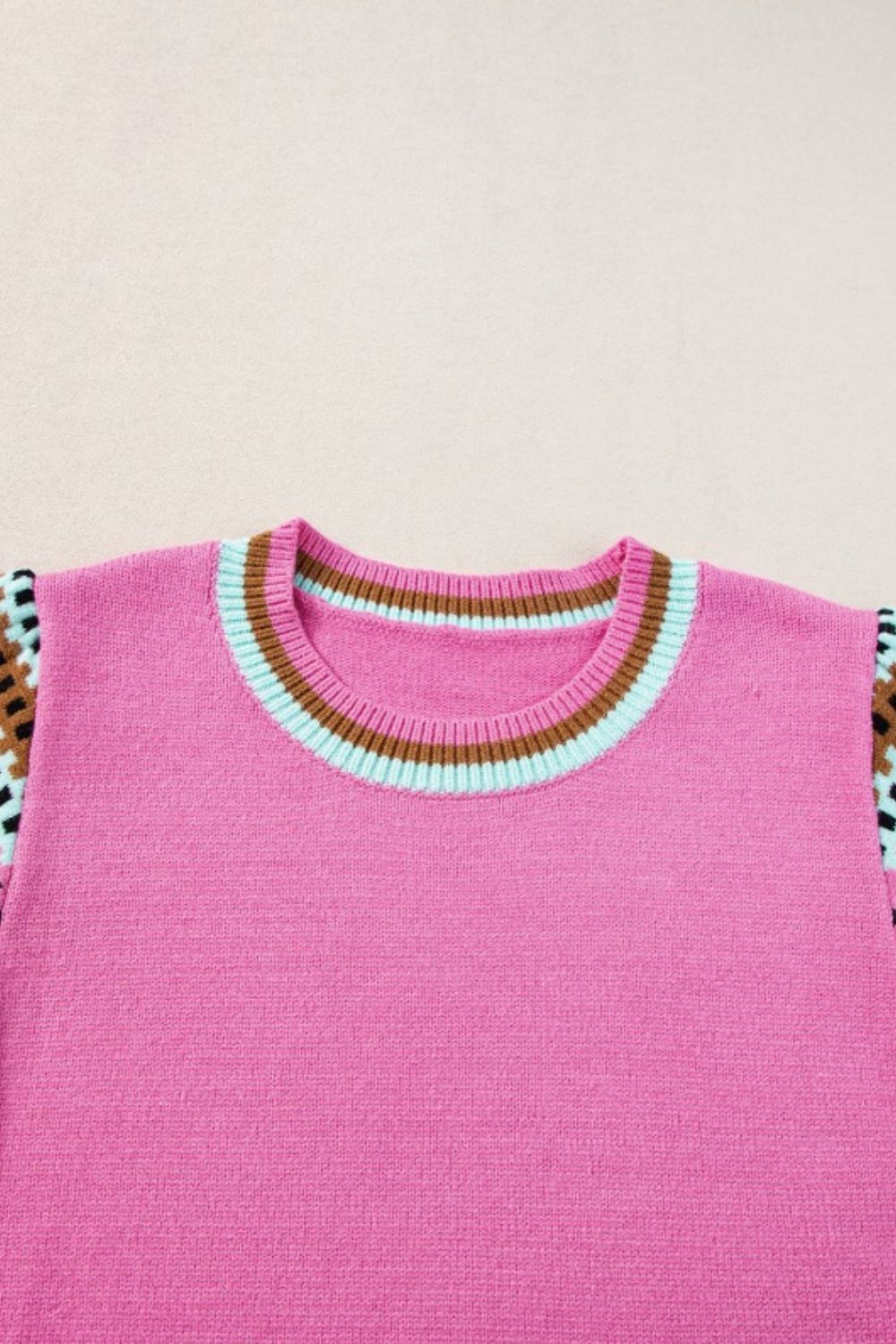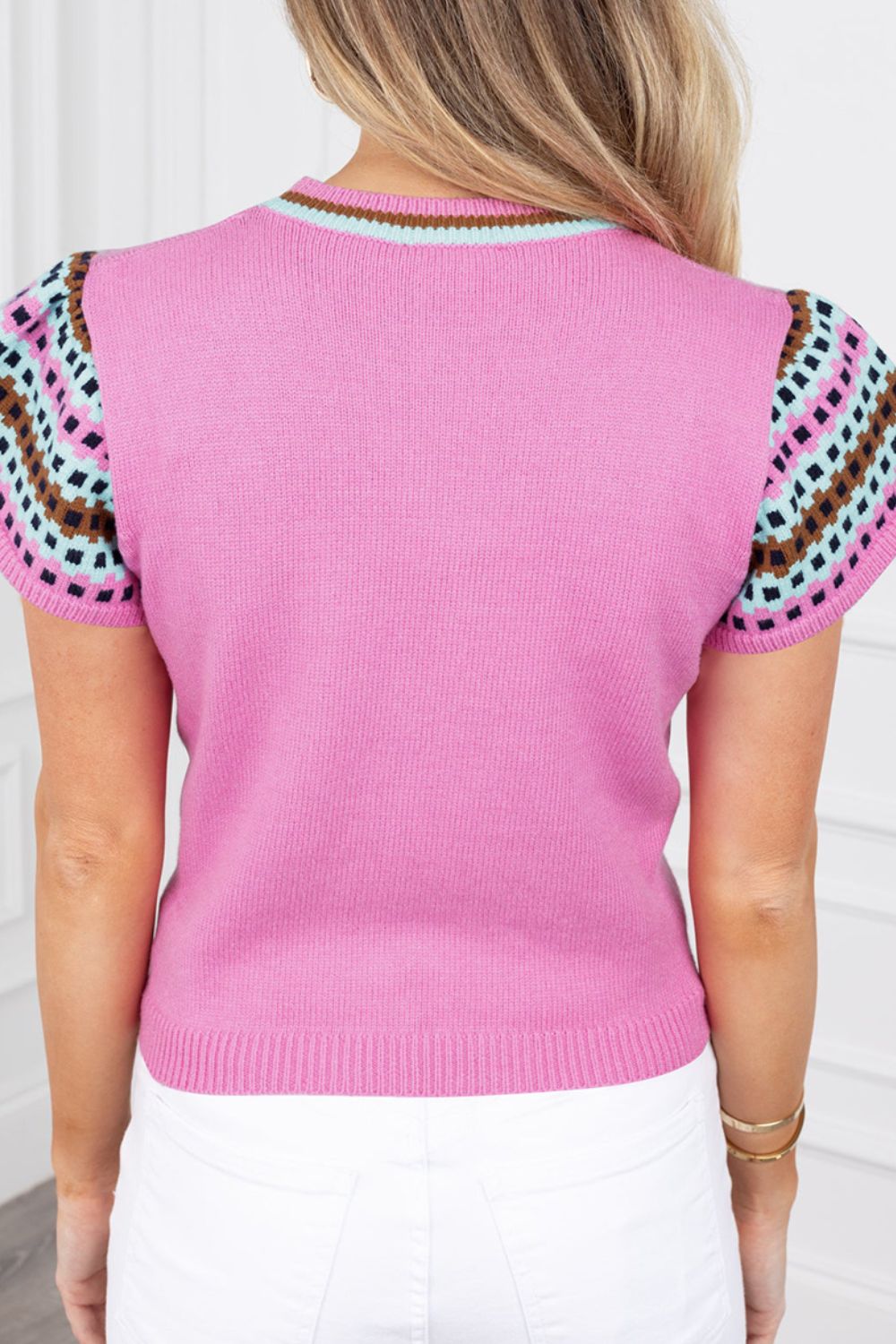 Contrast Short Sleeves Round Neck Sweater
