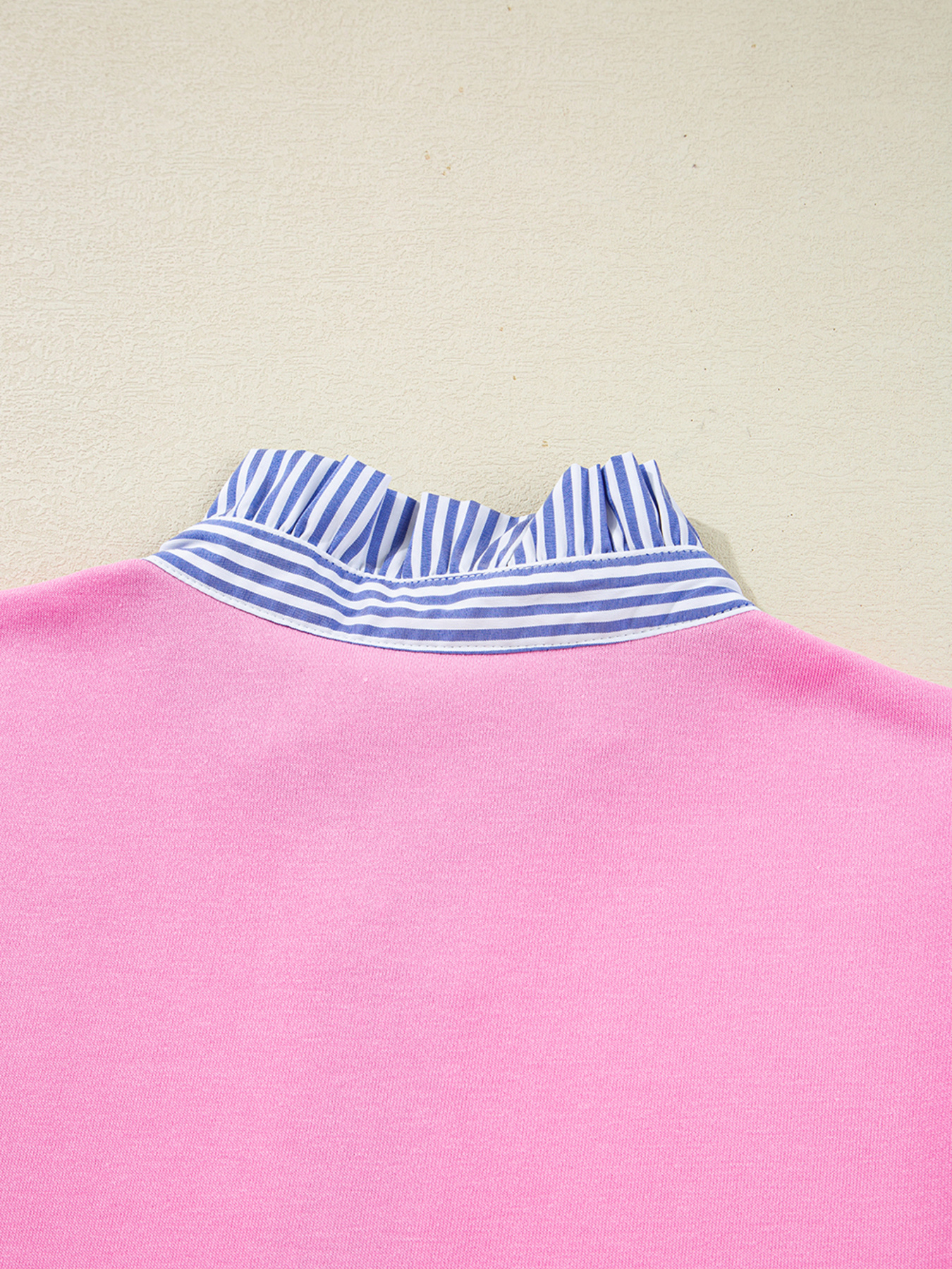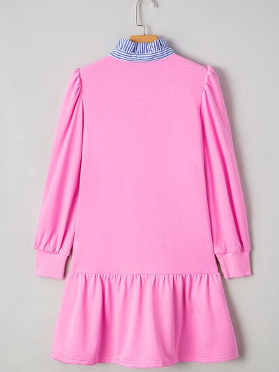 Contrast Striped Collar Patchwork Puff Sleeve Ruffle Hem Mini Dress