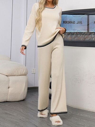 Contrast Trim Round Neck Top and Pants Sweater Set