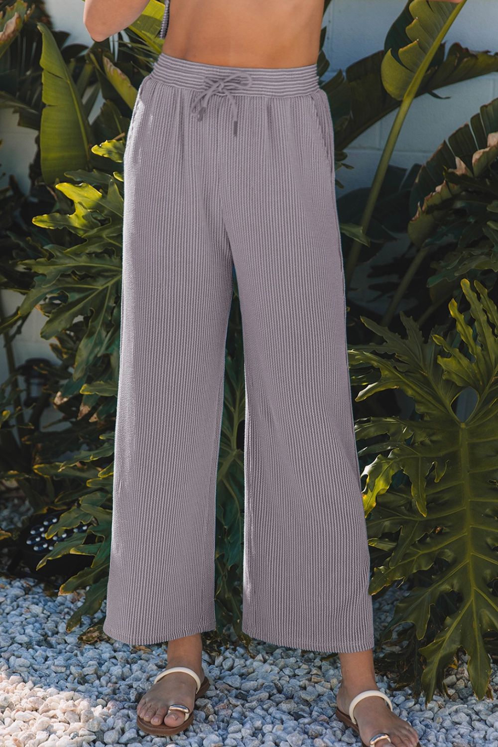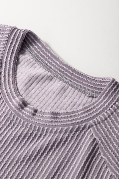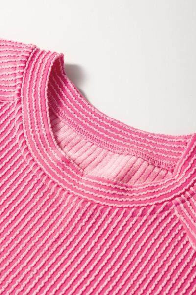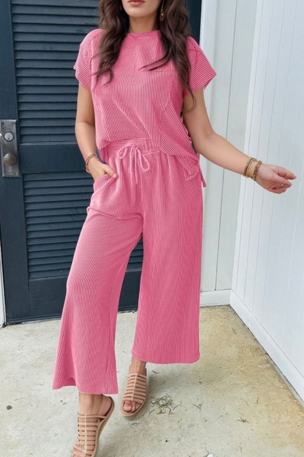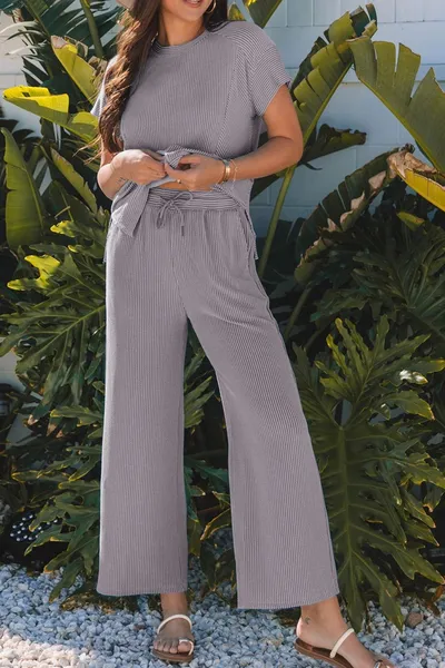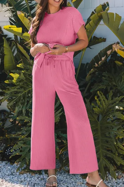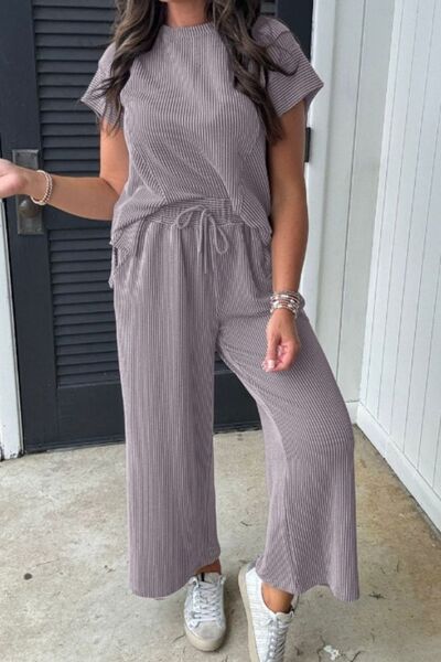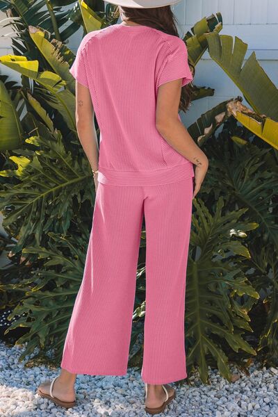 Corded Knit Short Sleeve T-Shirt and Wide Leg Pants Set