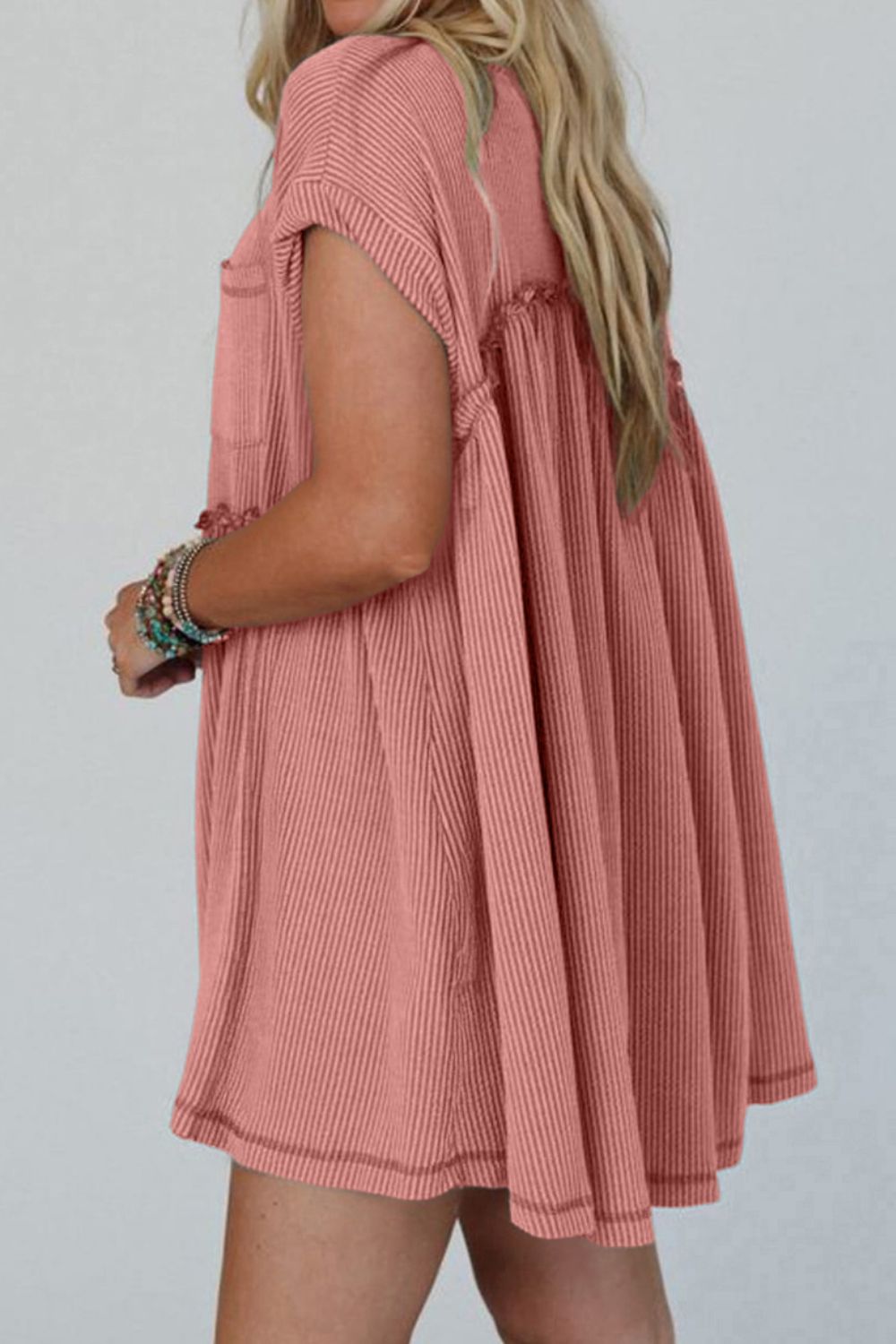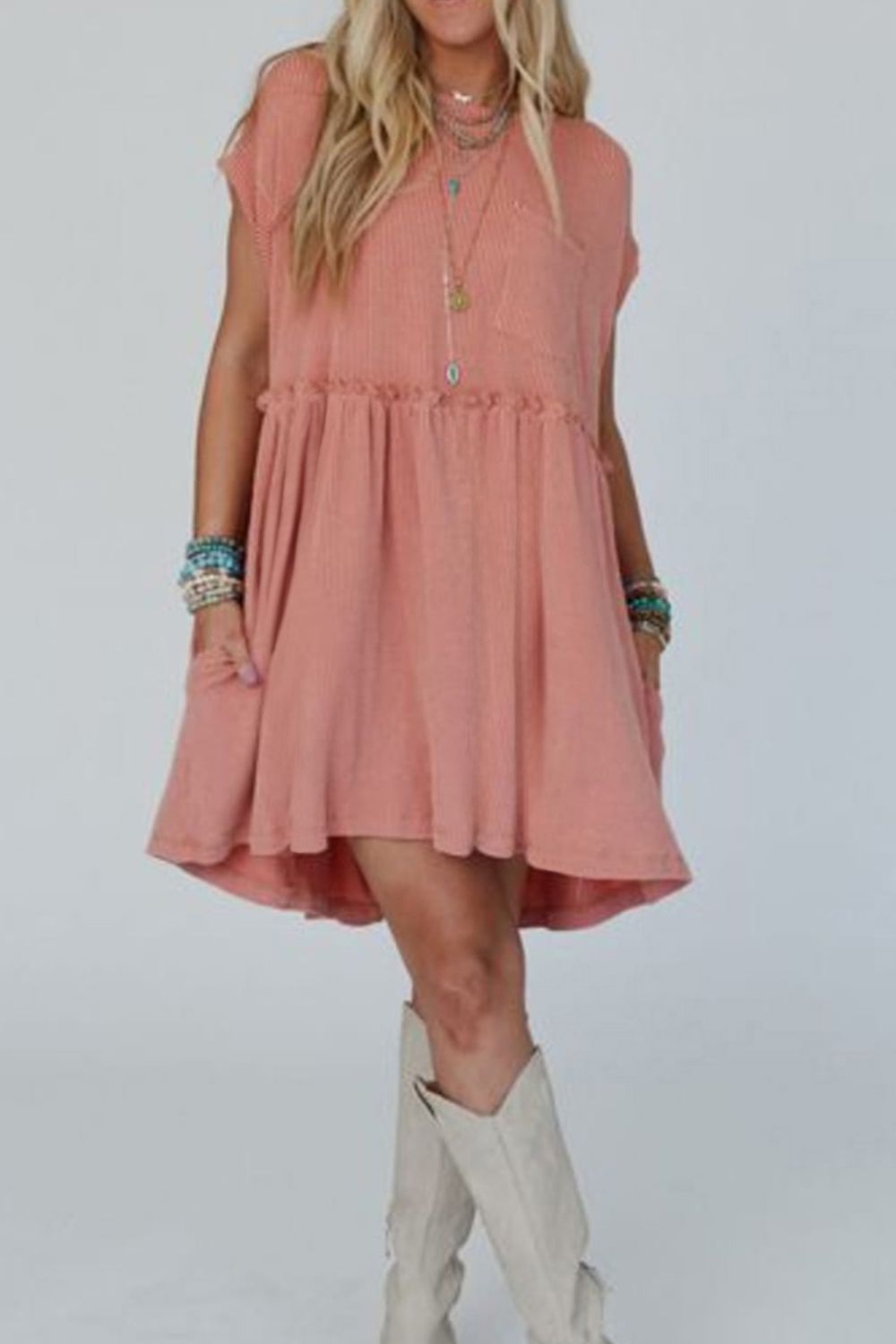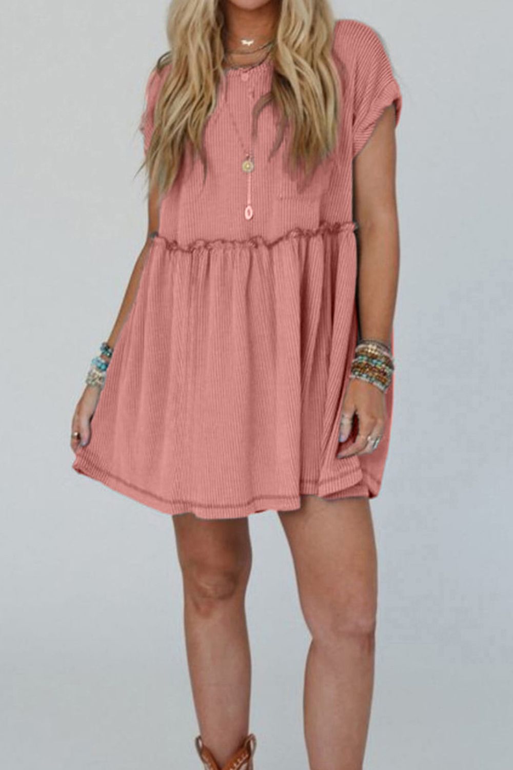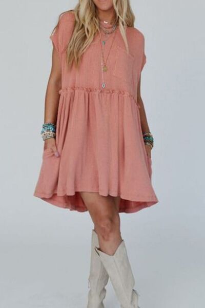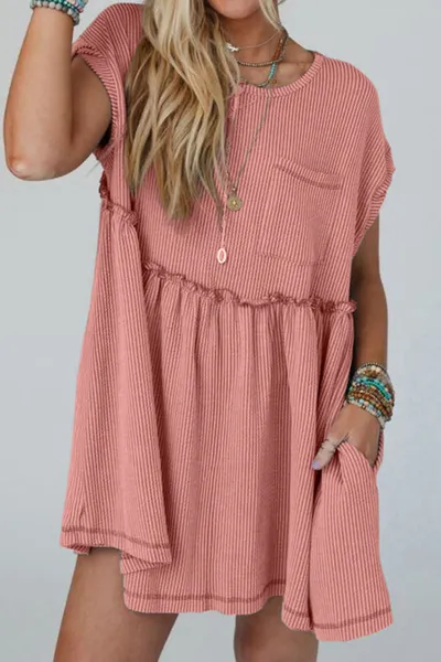 Corded Knit Textured Patched Pocket Frilled Swing Mini Dress with Pockets