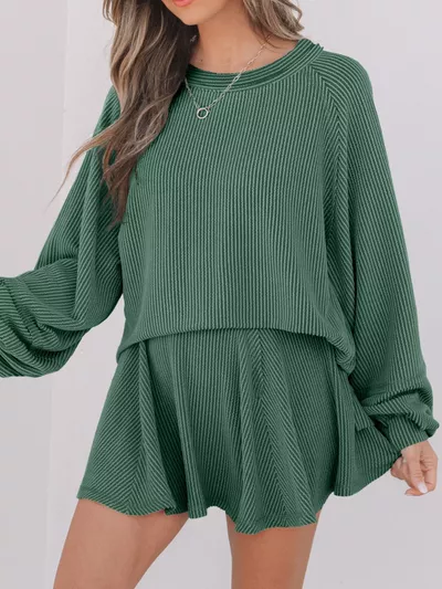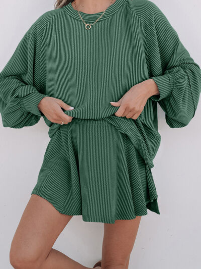 Corded Lantern Sleeve Top and High Waist Mini Skirt Set