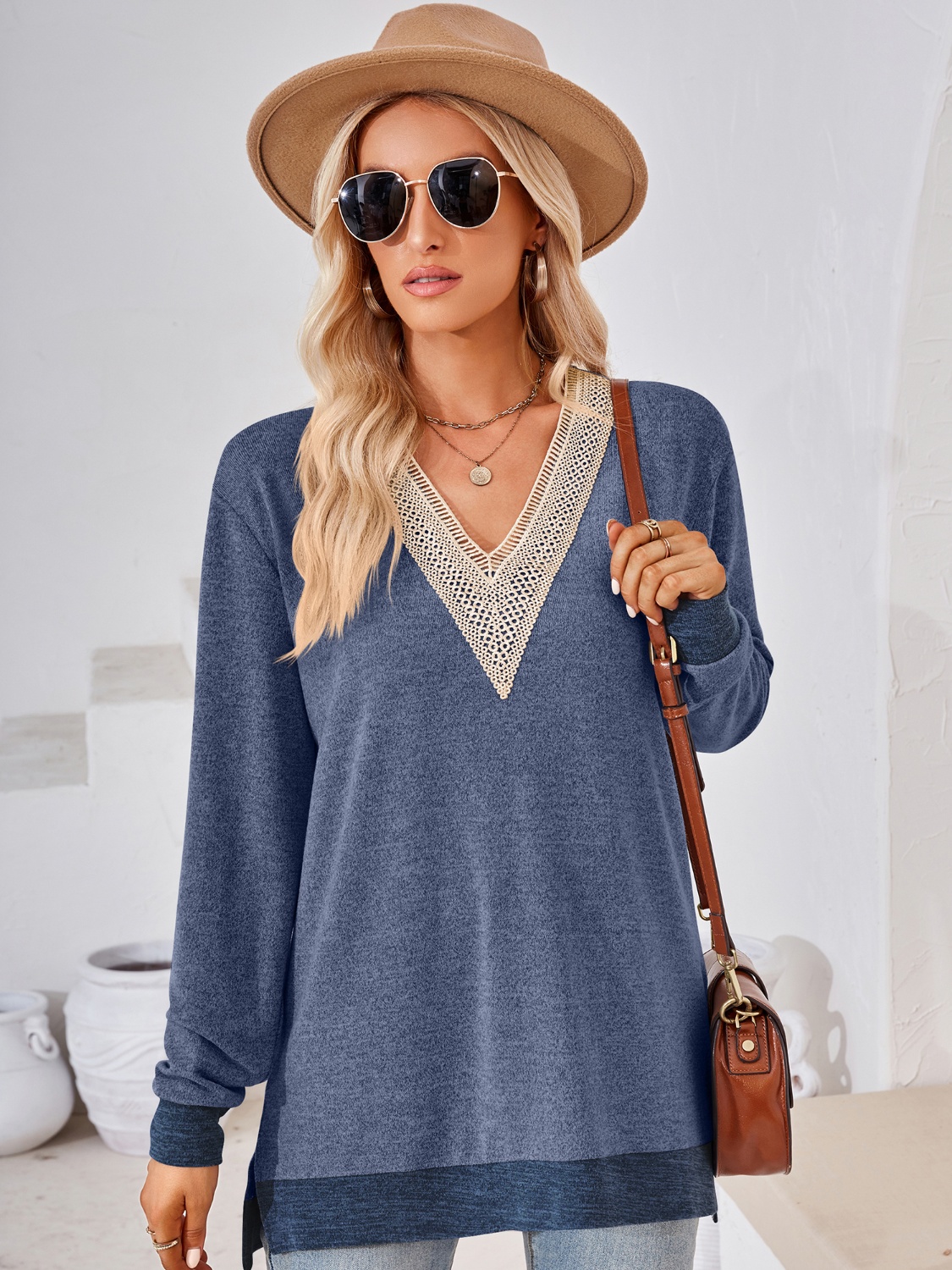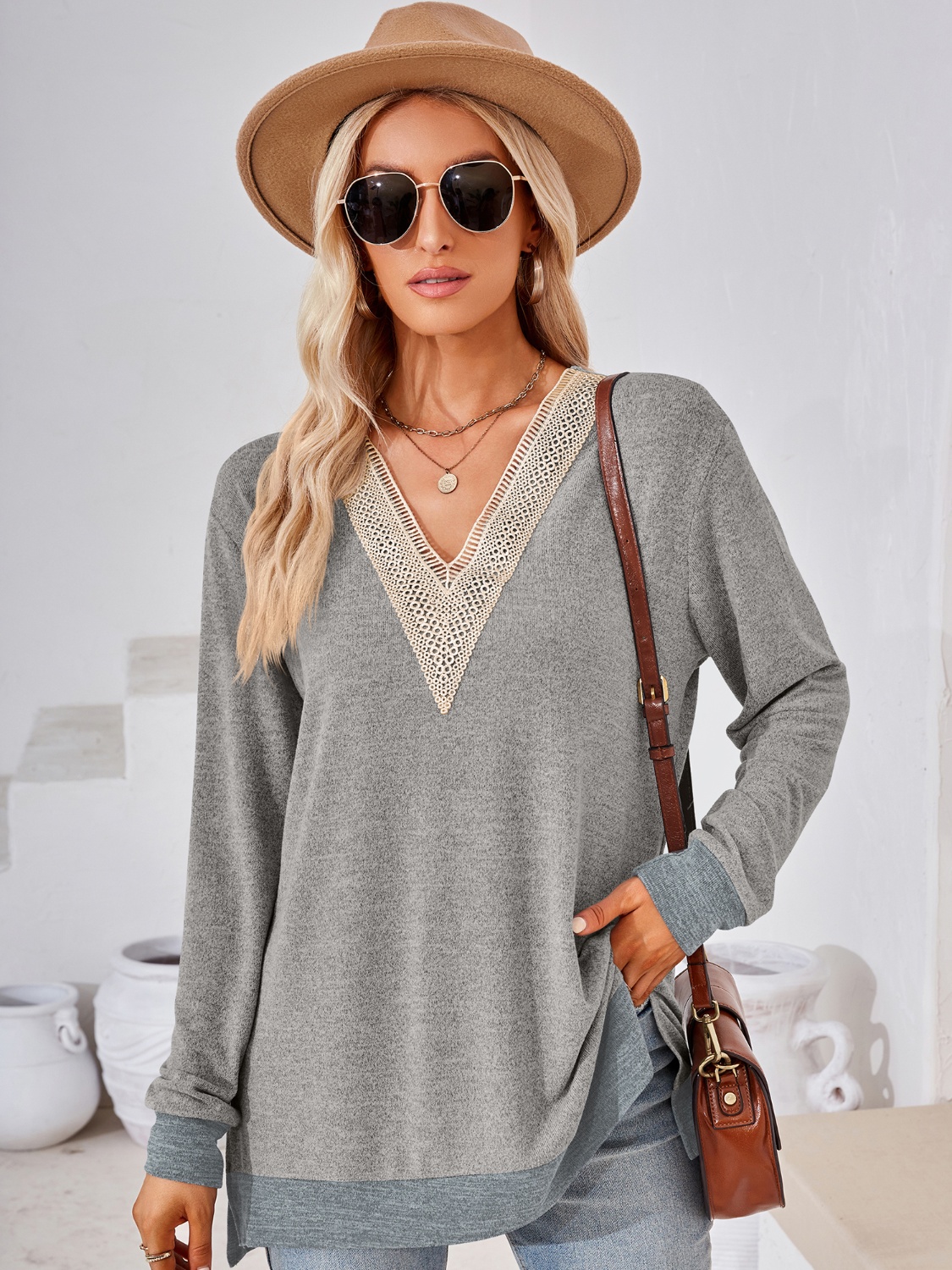 Crochet Contrast V-Neck Long Sleeve Slit T-Shirt