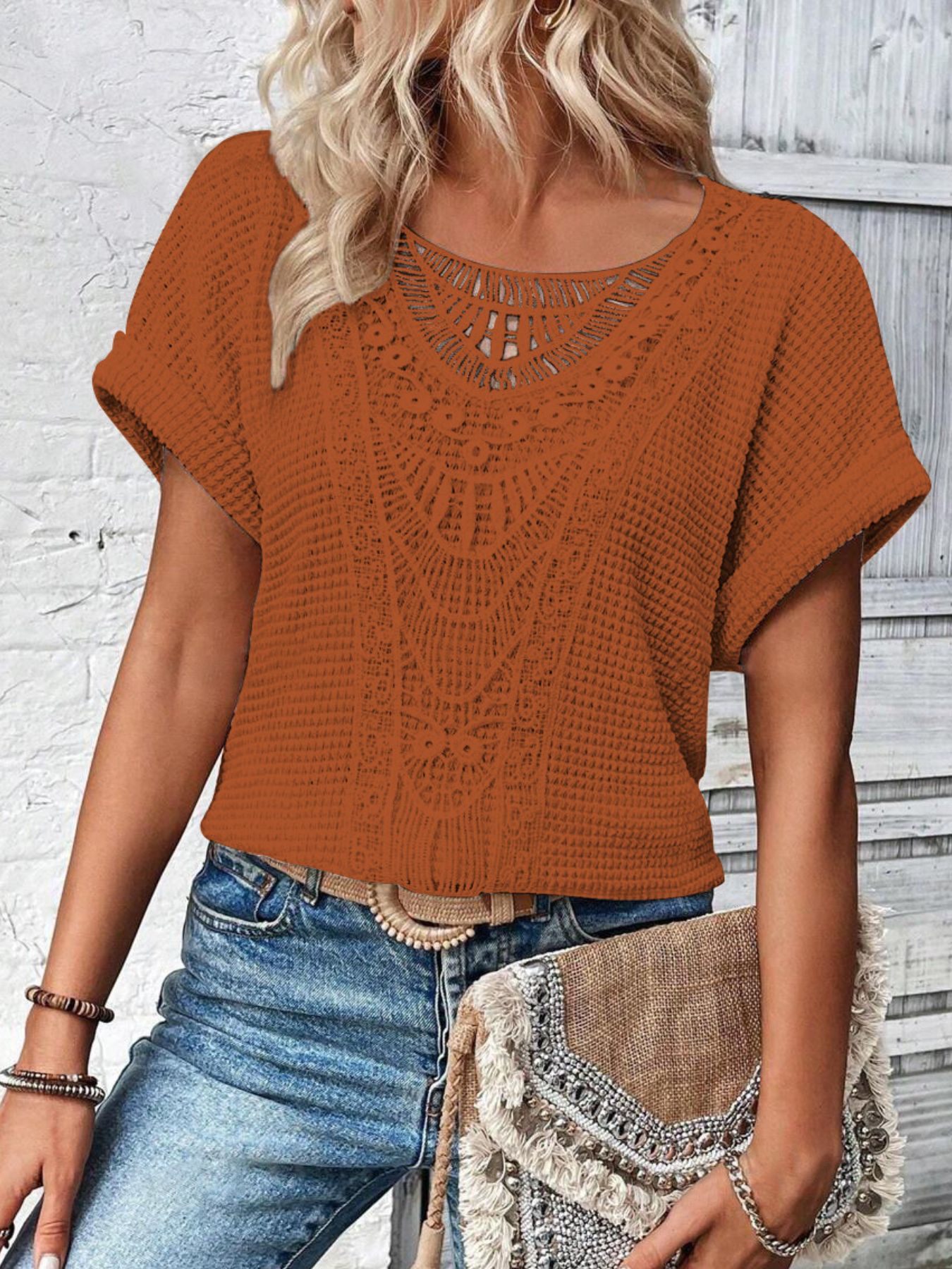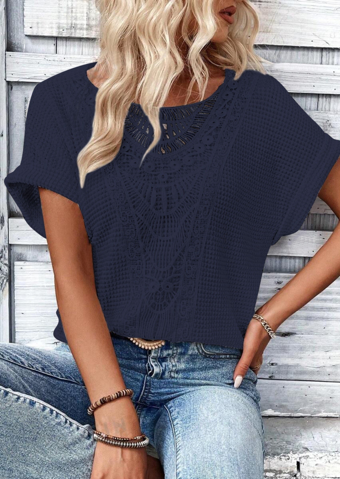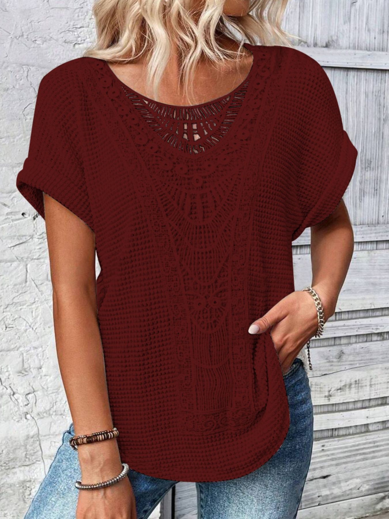 Crochet Lace Short Sleeve Casual T-Shirt