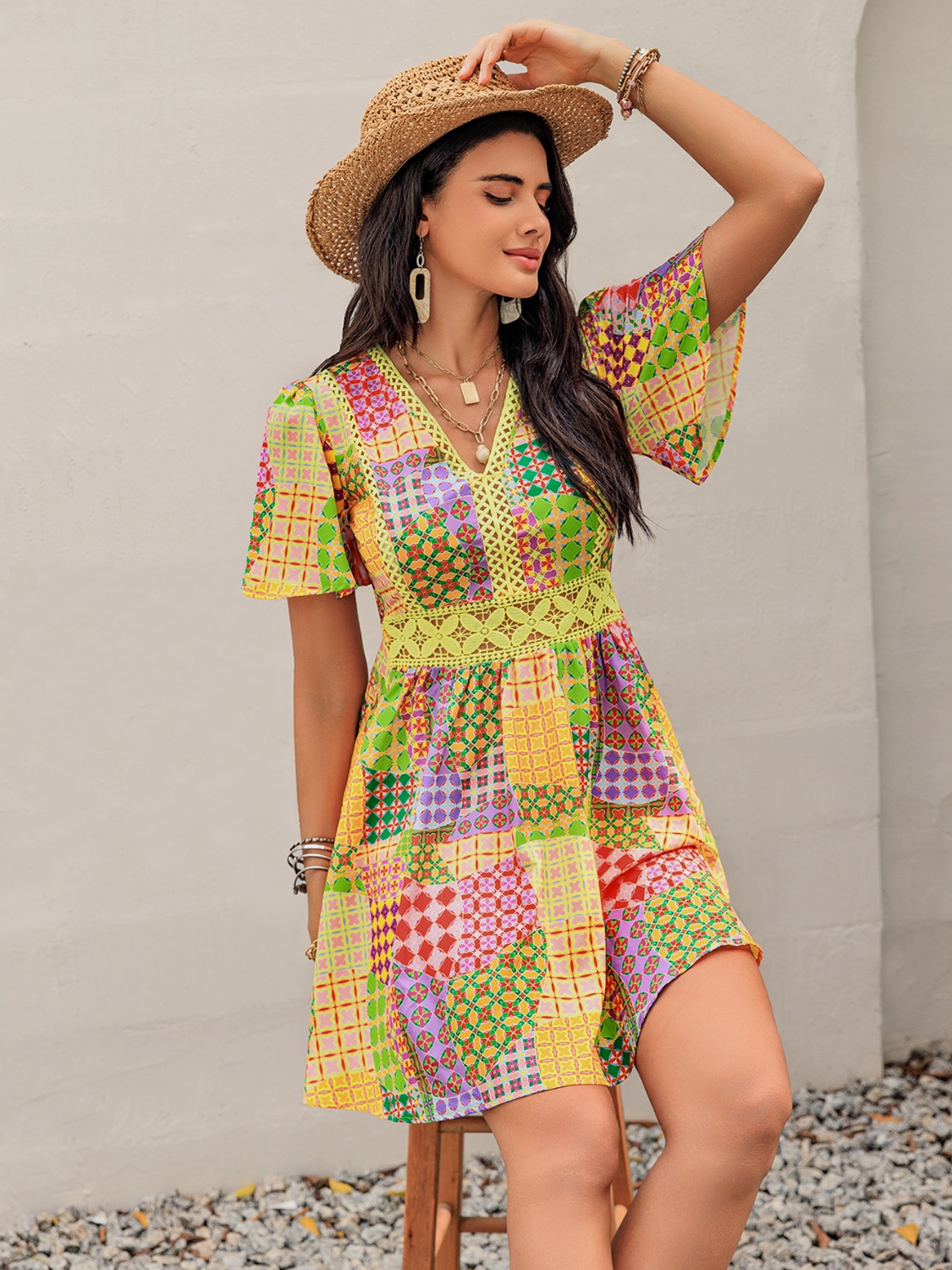 Crochet Trim Printed V-Neck Short Sleeve Mini Dress