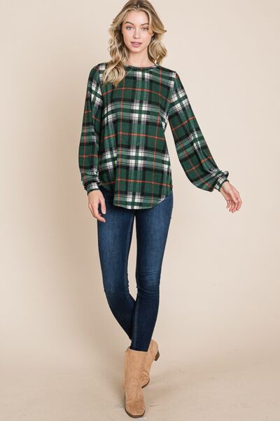 Curved Hem Plaid Round Neck Long Sleeve Top