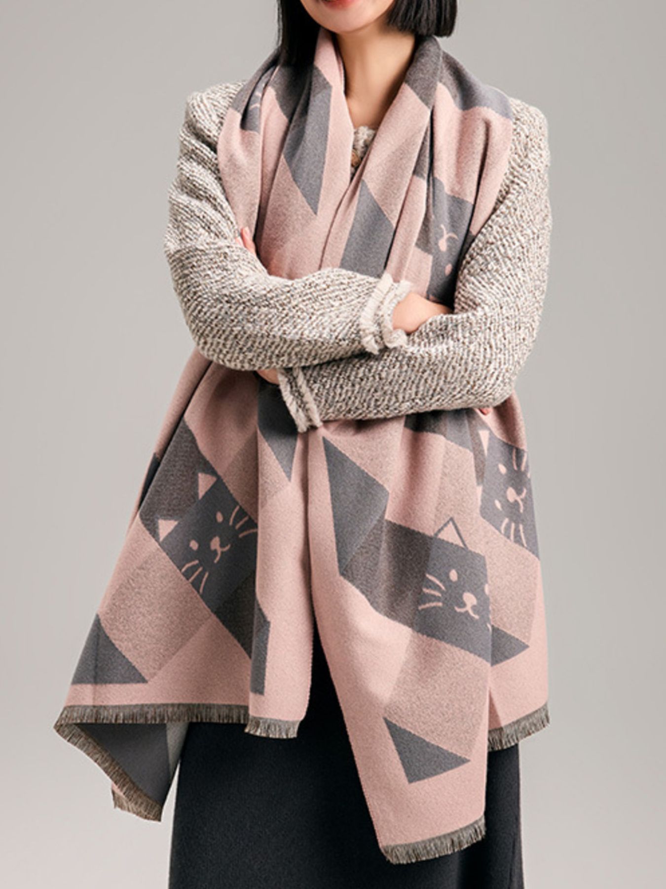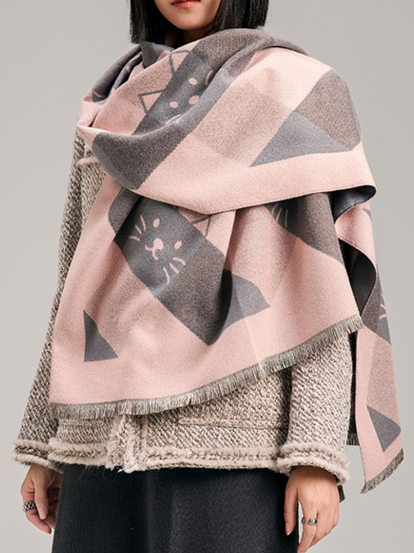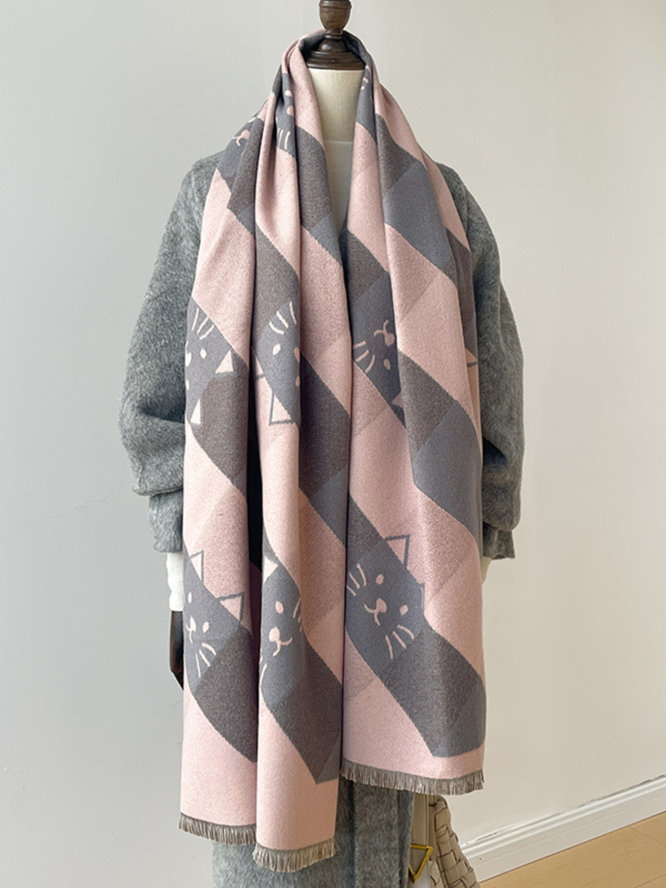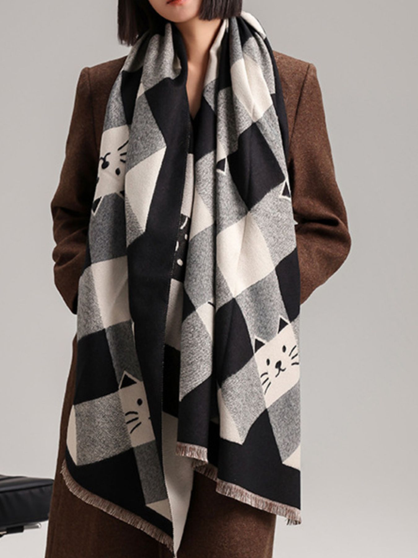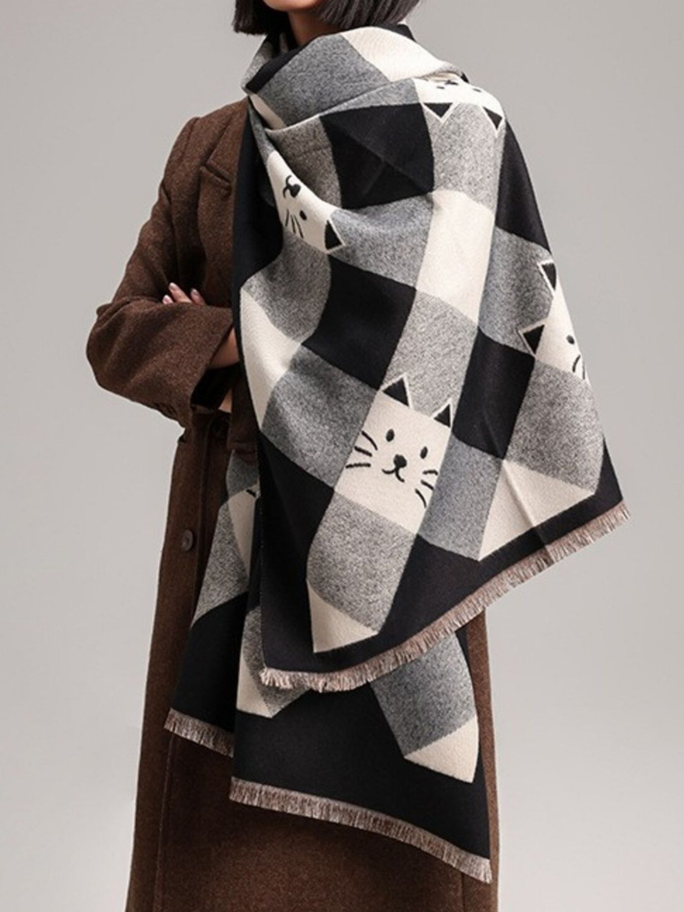 Cute Cat Pattern Plaid Raw Hem Scarf