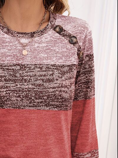 Decorative Button Contrast Round Neck Long Sleeve T-Shirt