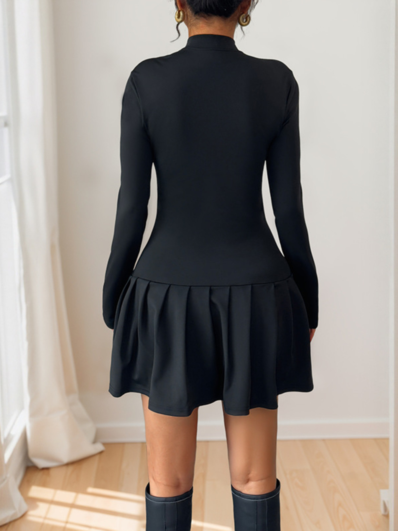 Decorative Button Mock Neck Long Sleeve Mini Dress
