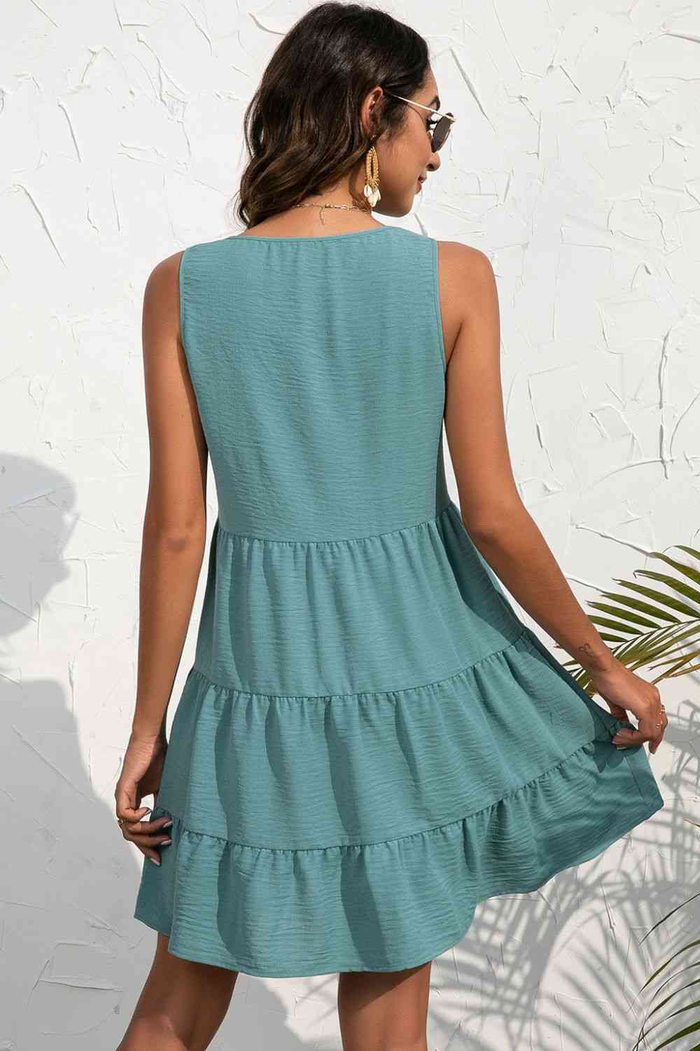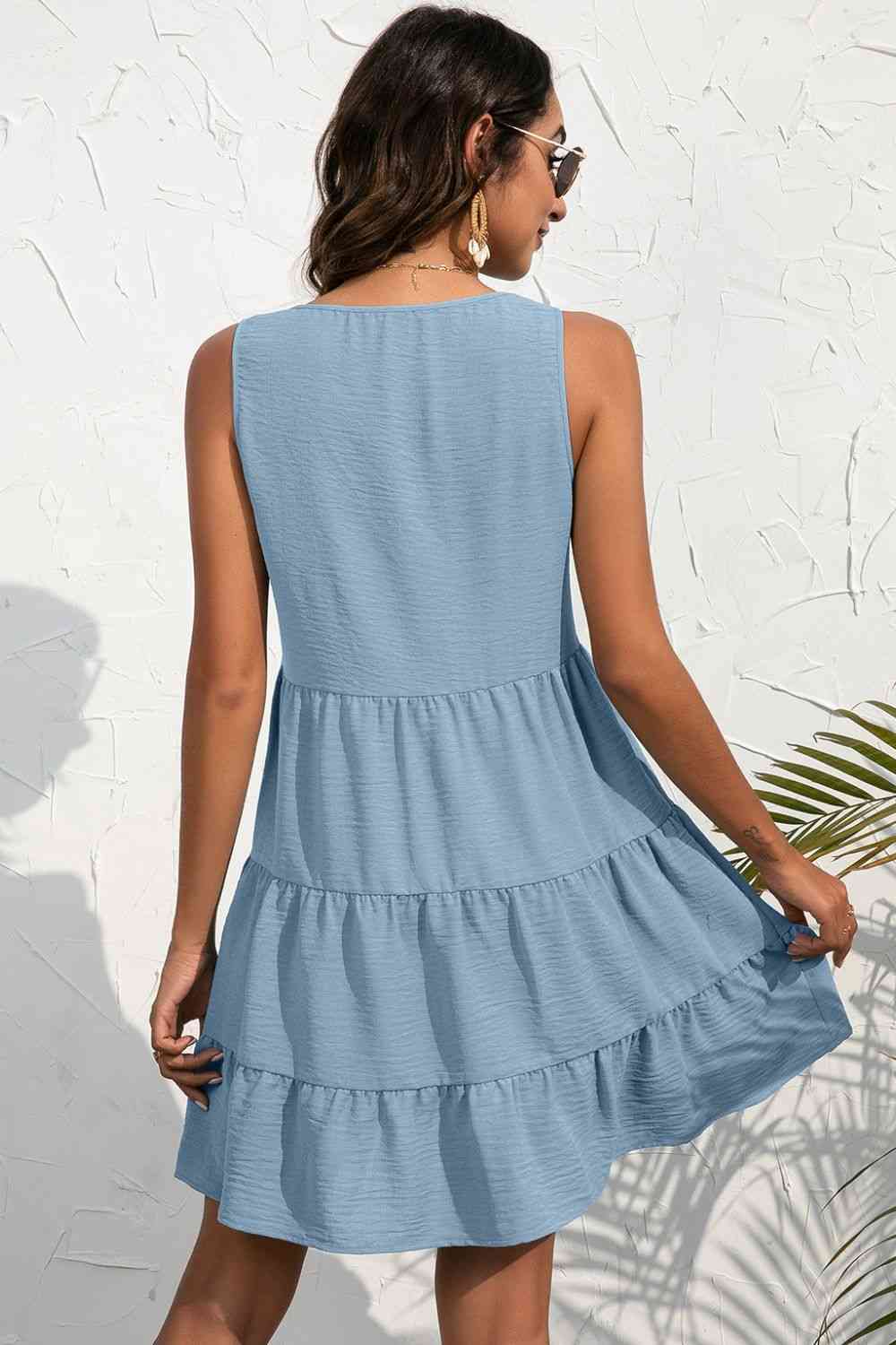 Decorative Button V-Neck Tiered Sleeveless Dress