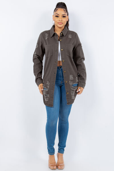 Distressed Button Up Long Sleeve Denim Jacket