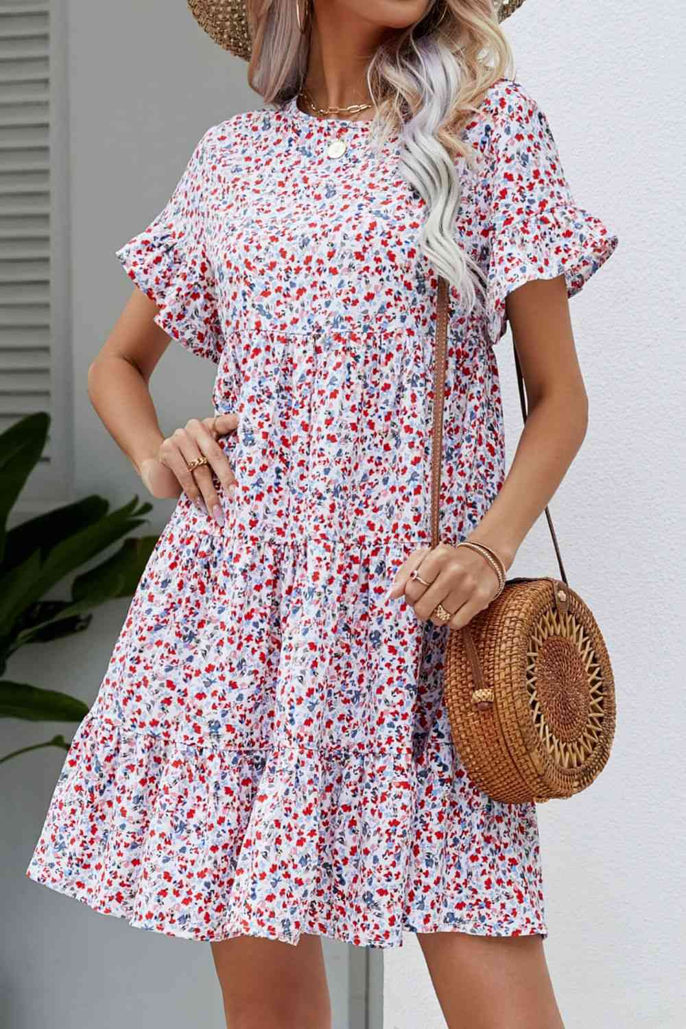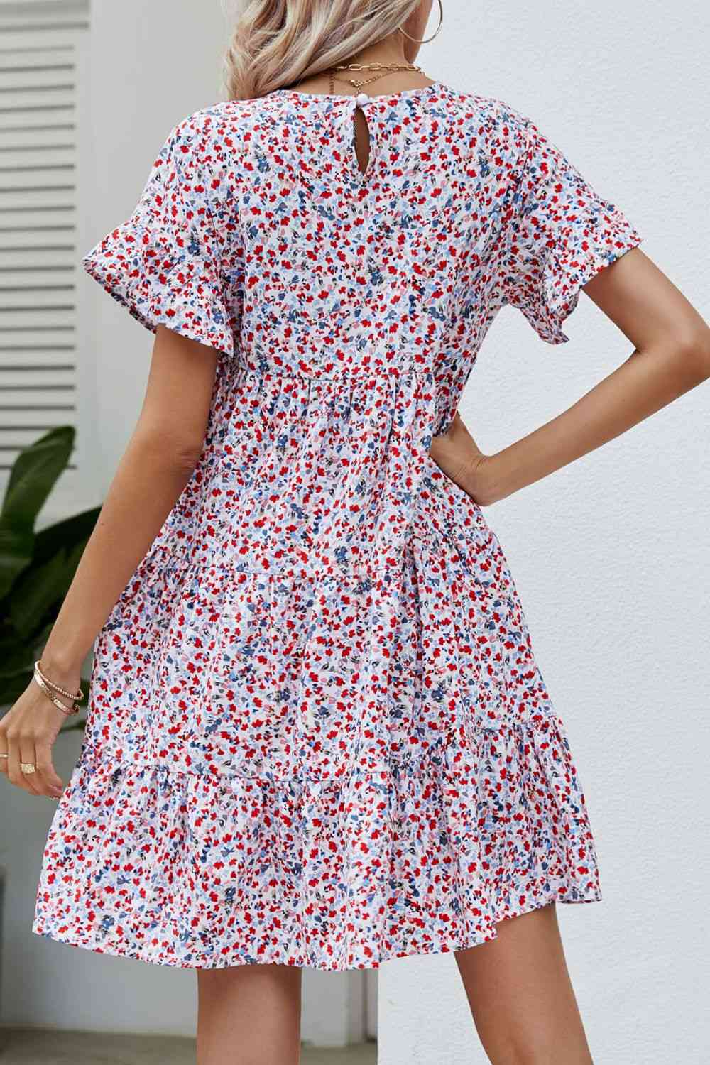 Ditsy Floral Flounce Sleeve Tiered Dress