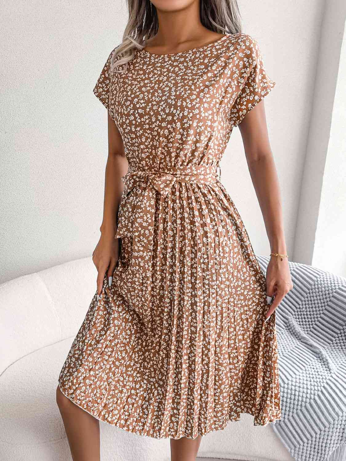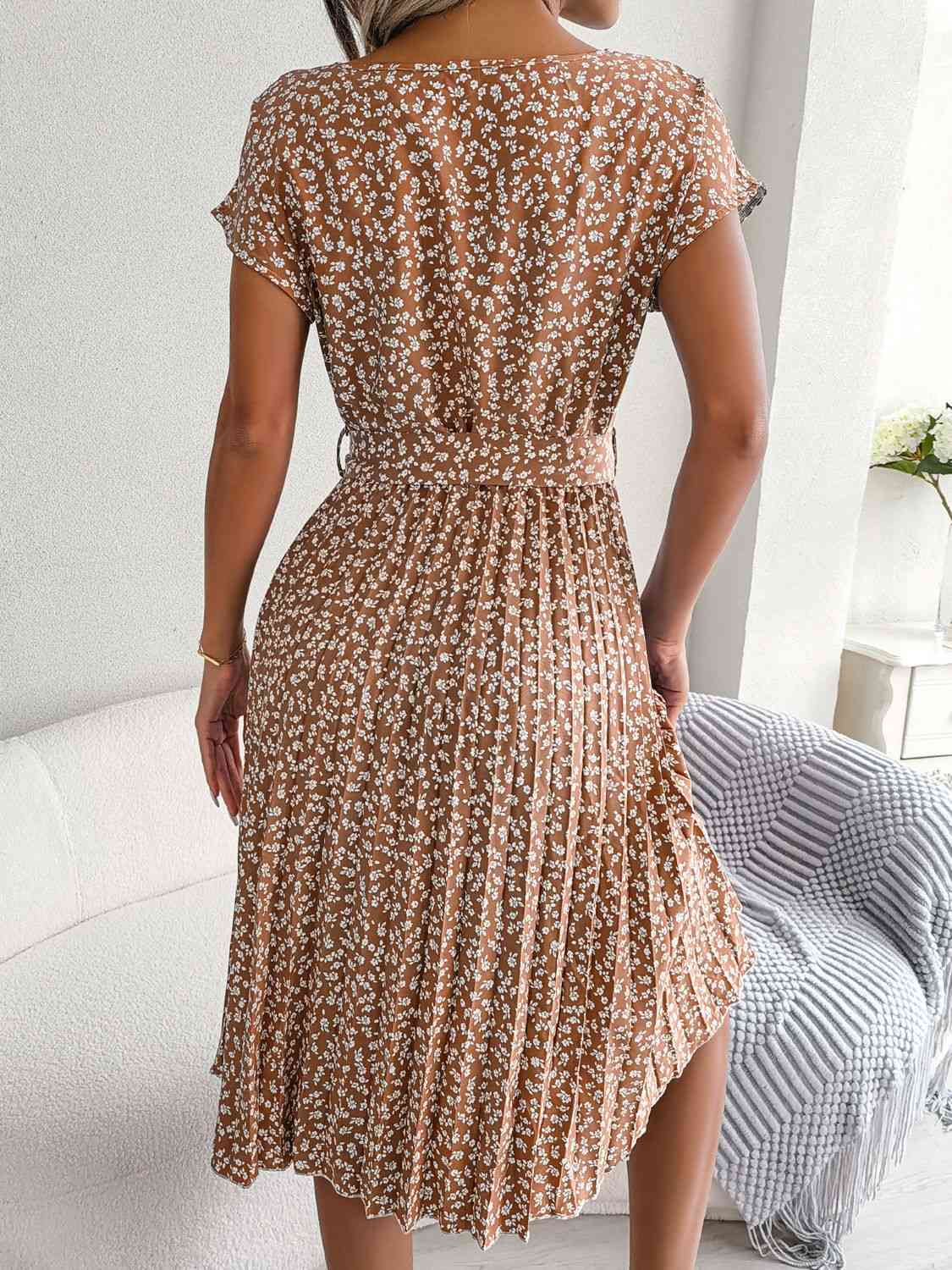 Ditsy Floral Pleated Belted Dress