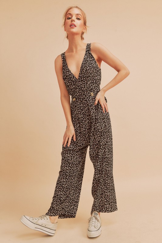 Ditsy Floral Surplice Sleeveless Wide Leg Jumpsuit