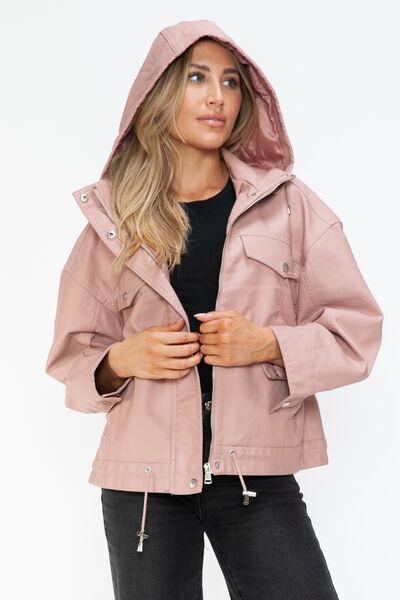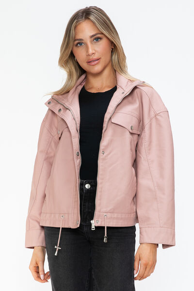 Drawstring Hem PU Leather Zip Up Jacket