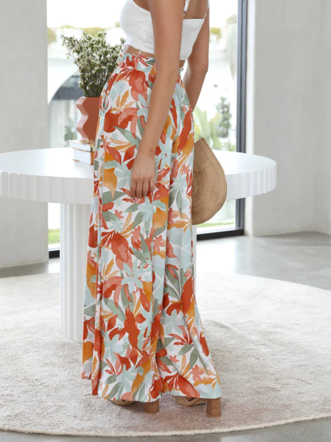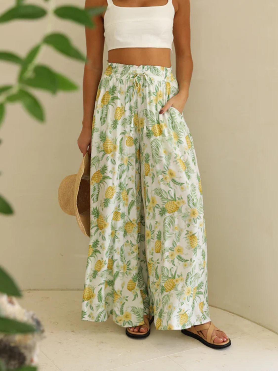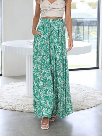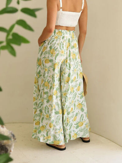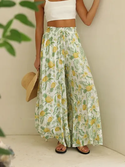 Drawstring Paperbag Waist Printed Wide Leg Pants