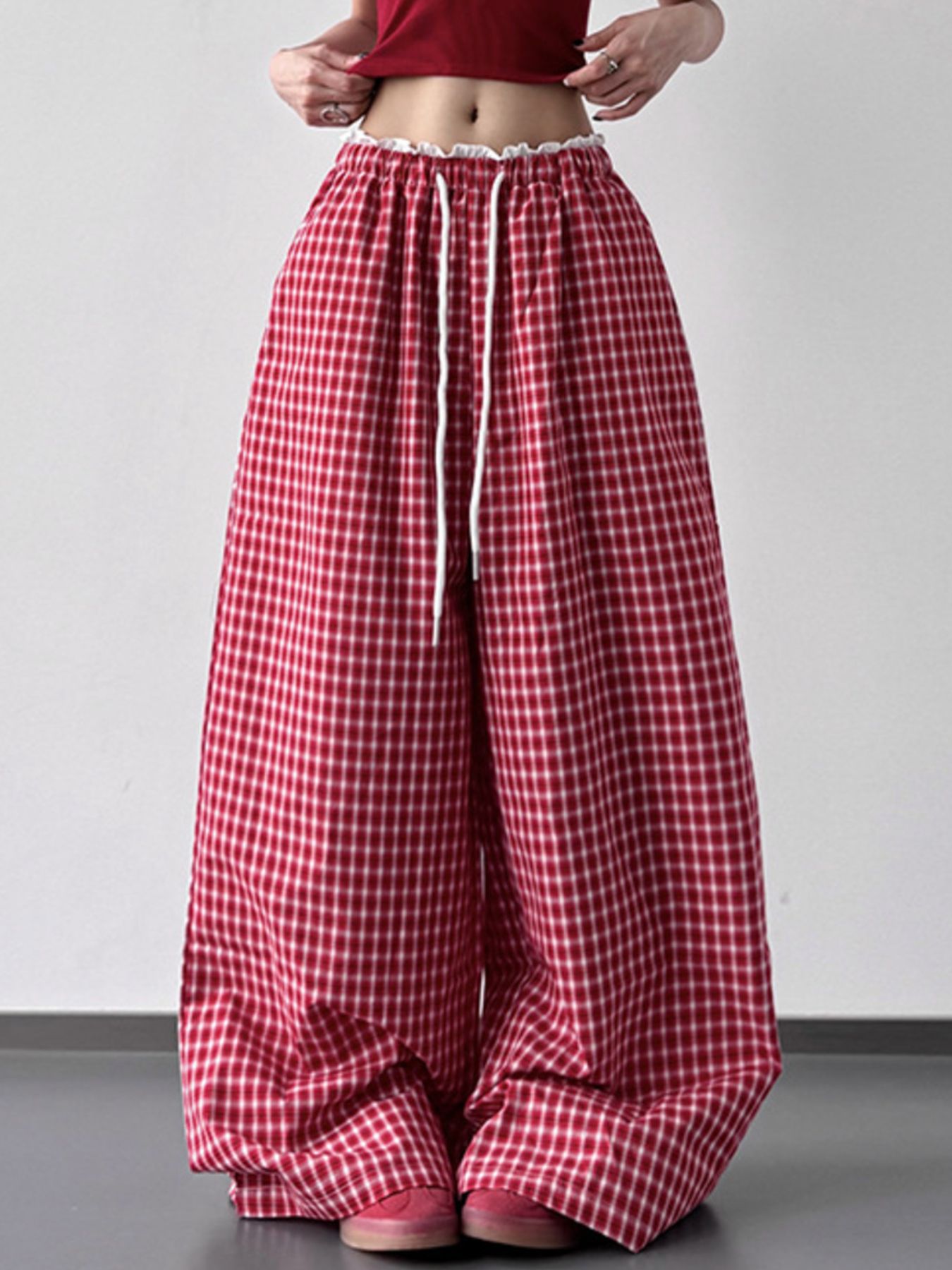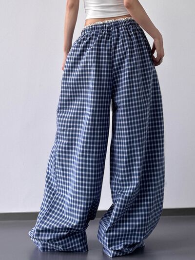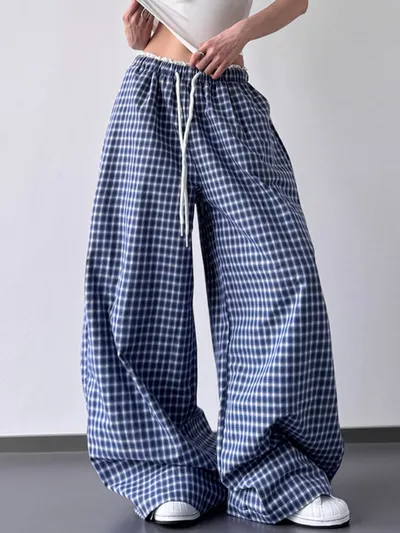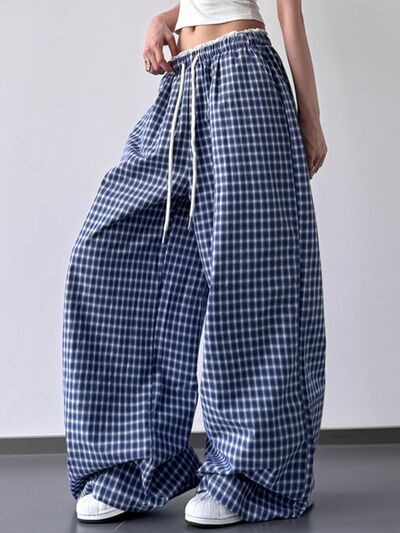 Drawstring Plaid Wide Leg Pants