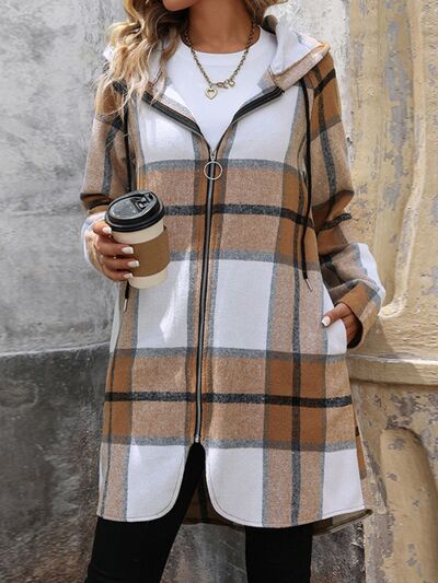 Drawstring Plaid Zip Up Long Sleeve Hooded Outerwear