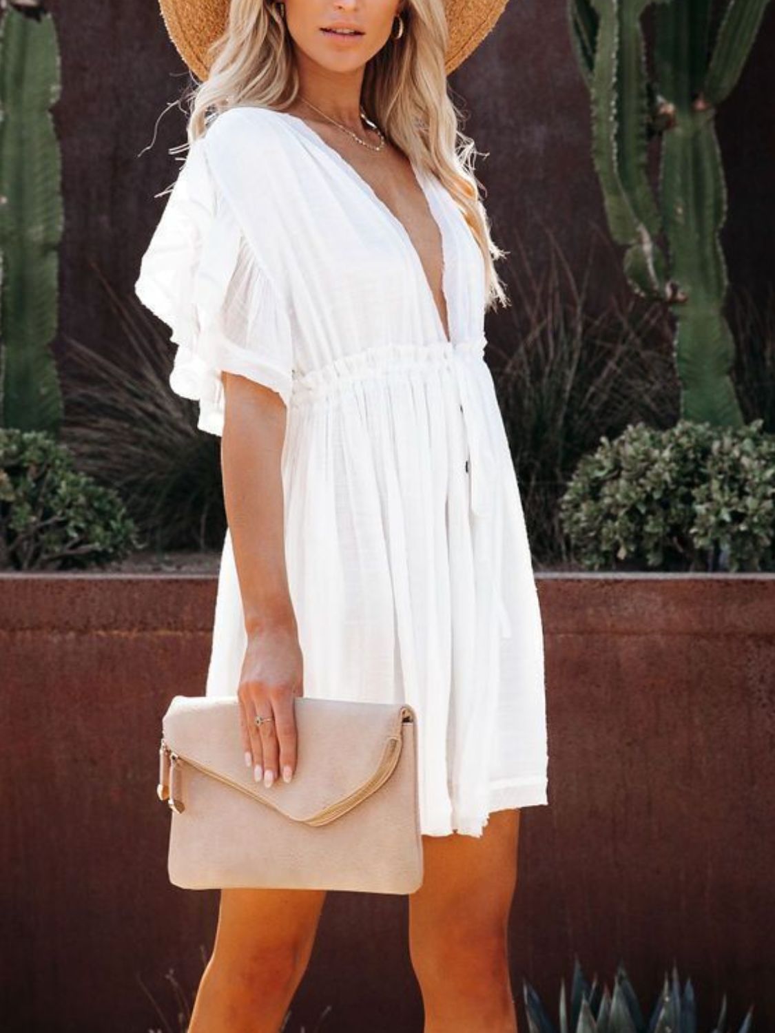 Drawstring Ruffled Half Sleeve Mini Dress