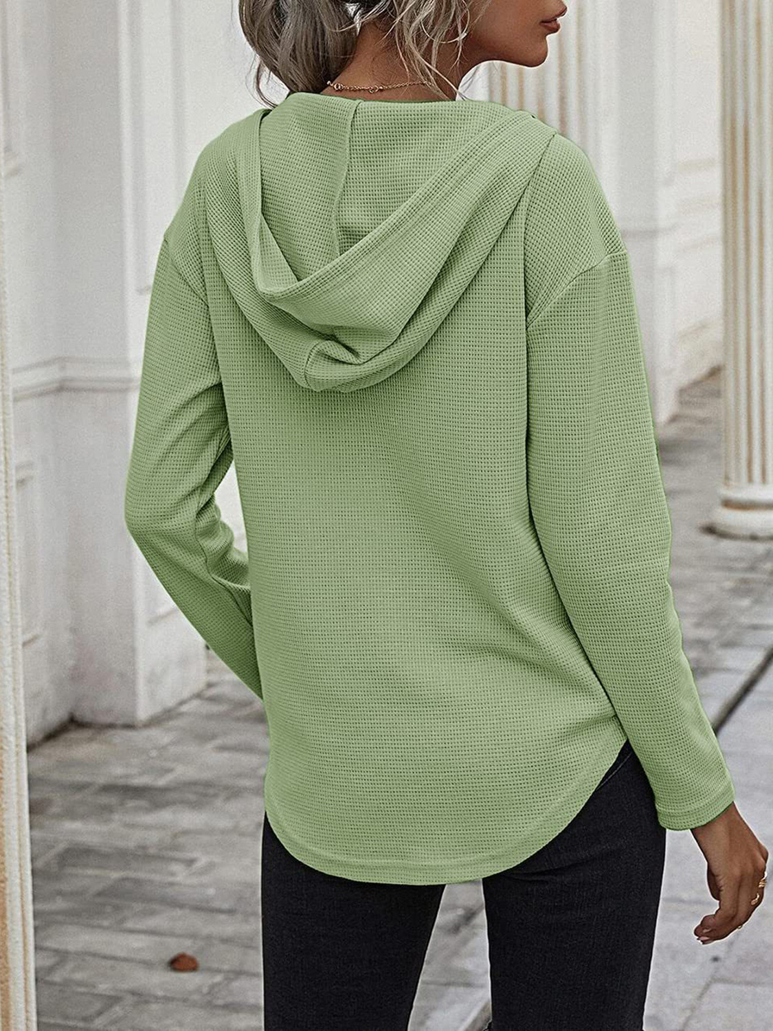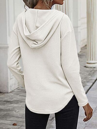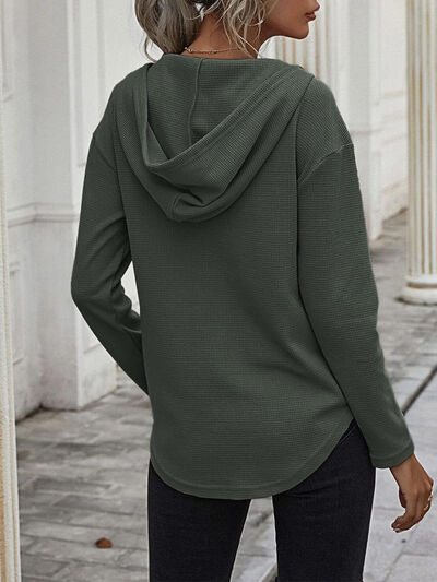 Drawstring Waffle Knit Long Sleeve Hooded Top