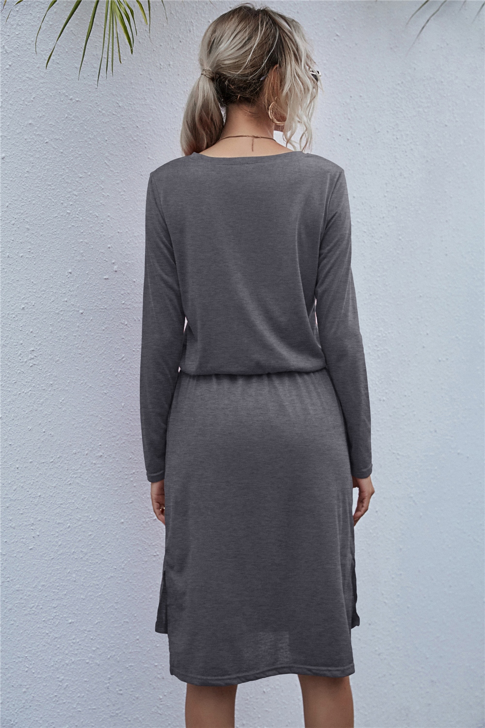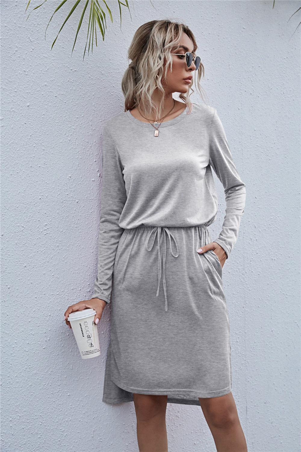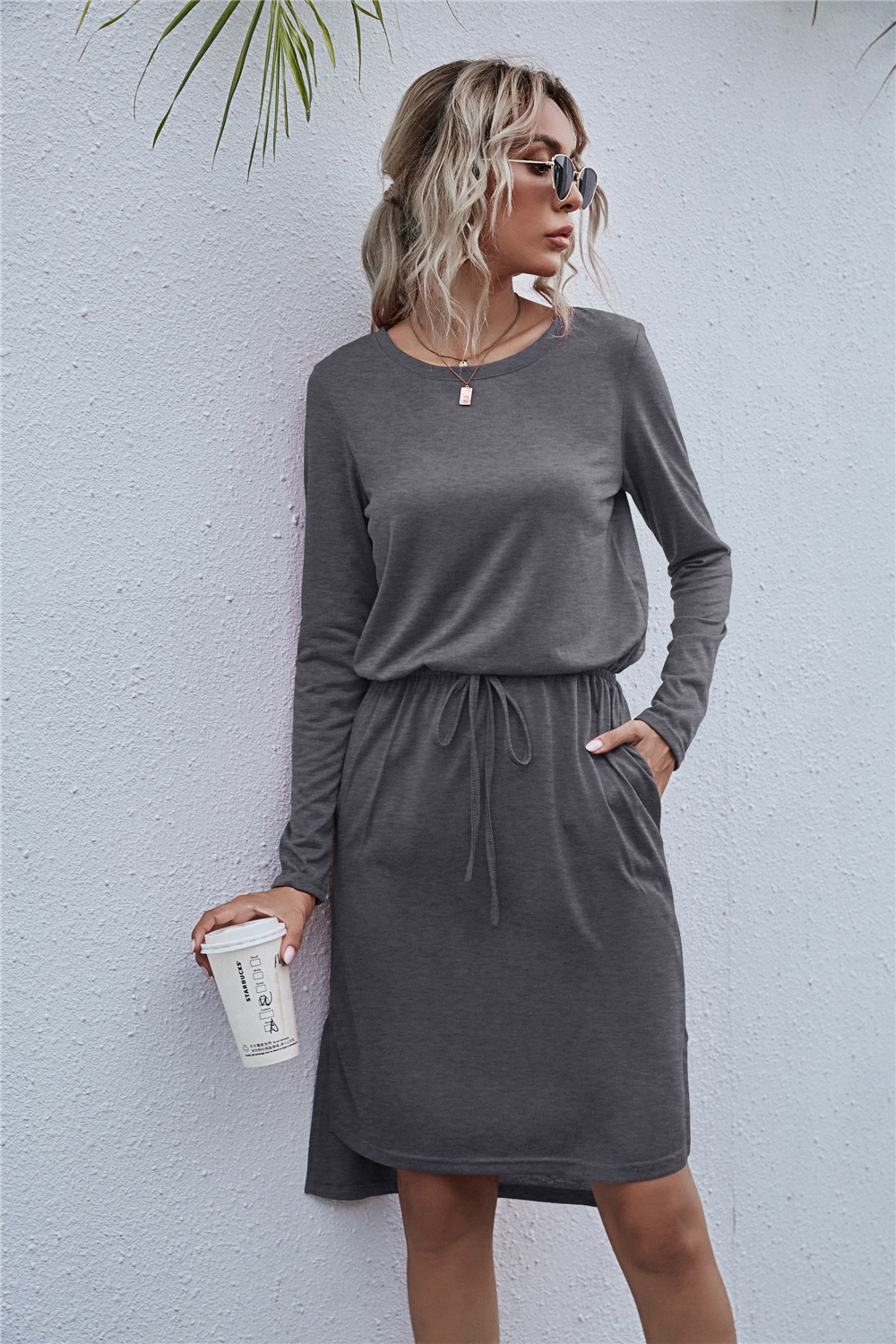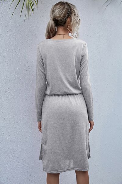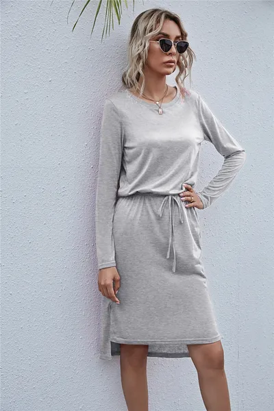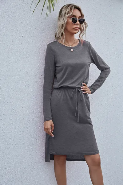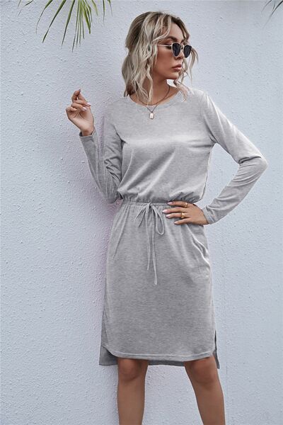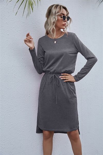 Drawstring Waist Round Neck Long Sleeve Dress