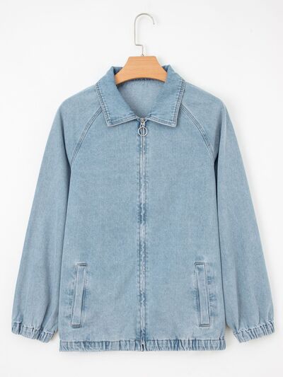 Elastic Edge Collared Zip Up Denim Jacket With Pocket