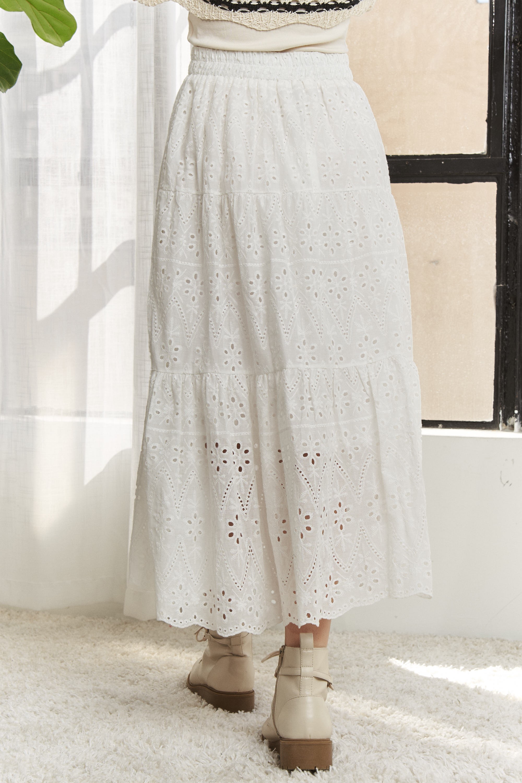 Elastic Waistband Tiered Midi Skirt