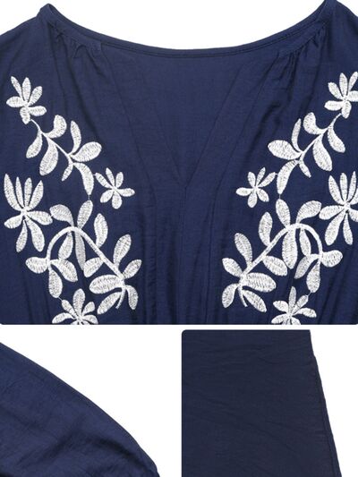 Embroidered Notched Long Sleeve Midi Dress