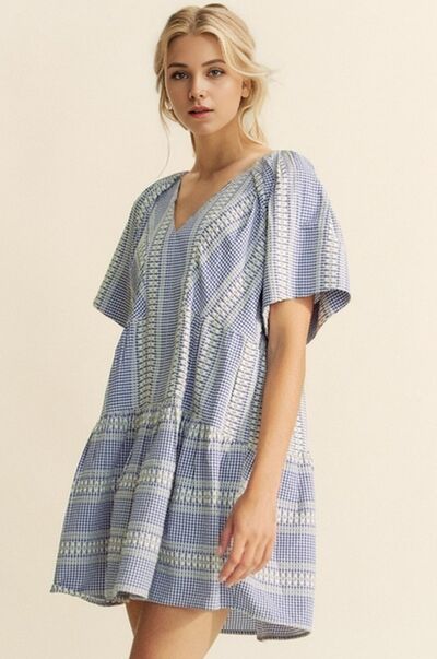 Embroidered Stripe Ruffled Gingham Mini Dress