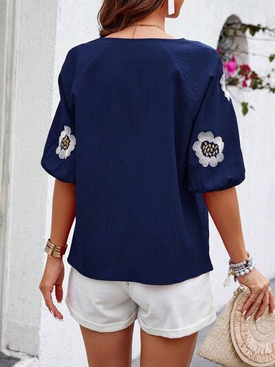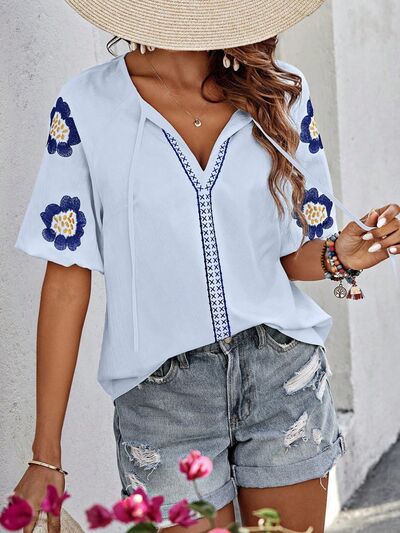 Embroidered Tie Neck Puff Sleeve Blouse