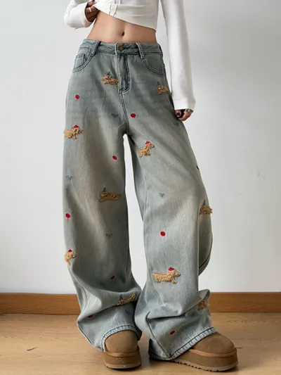Embroidered Wide Leg Jeans