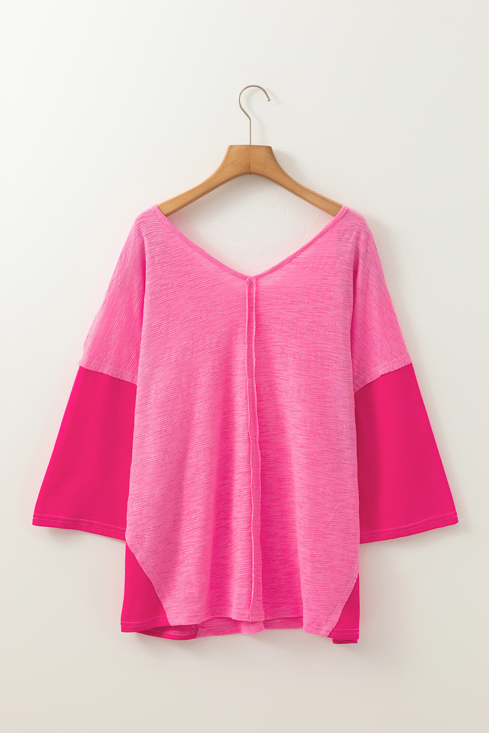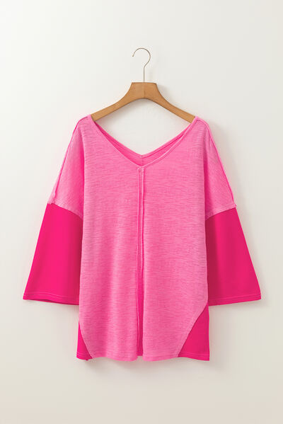 Exposed Seam V-Neck Three-Quarter Sleeve Blouse