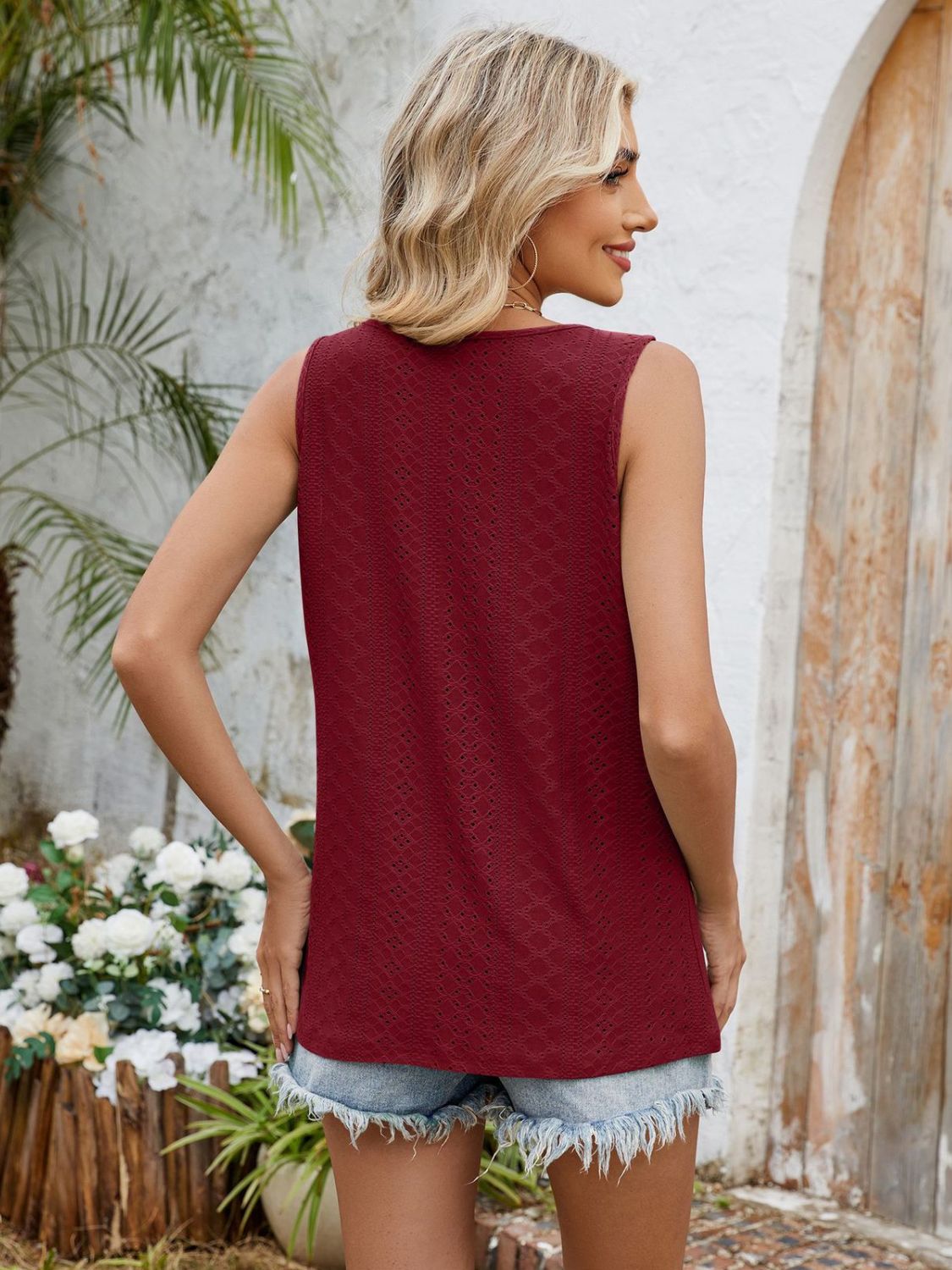 Eyelet Cutout Round Neck Tank