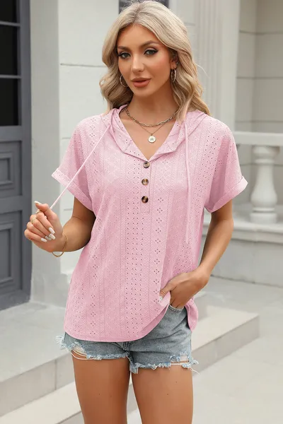 Eyelet Drawstring Hooded Short Sleeve Blouse