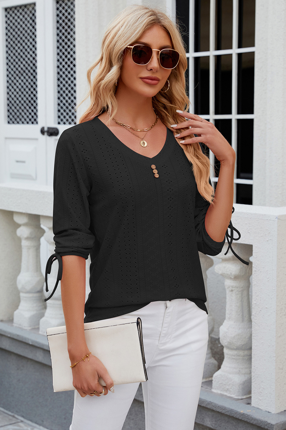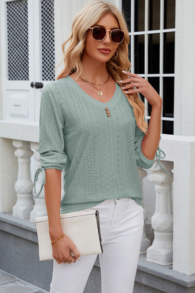 Eyelet Drawstring V-Neck Half Sleeve T-Shirt