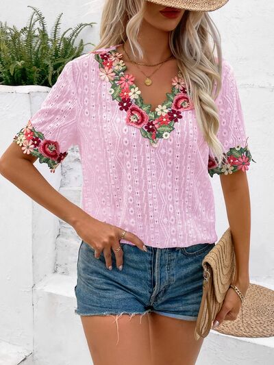 Eyelet Embroidered V-Neck Short Sleeve Blouse
