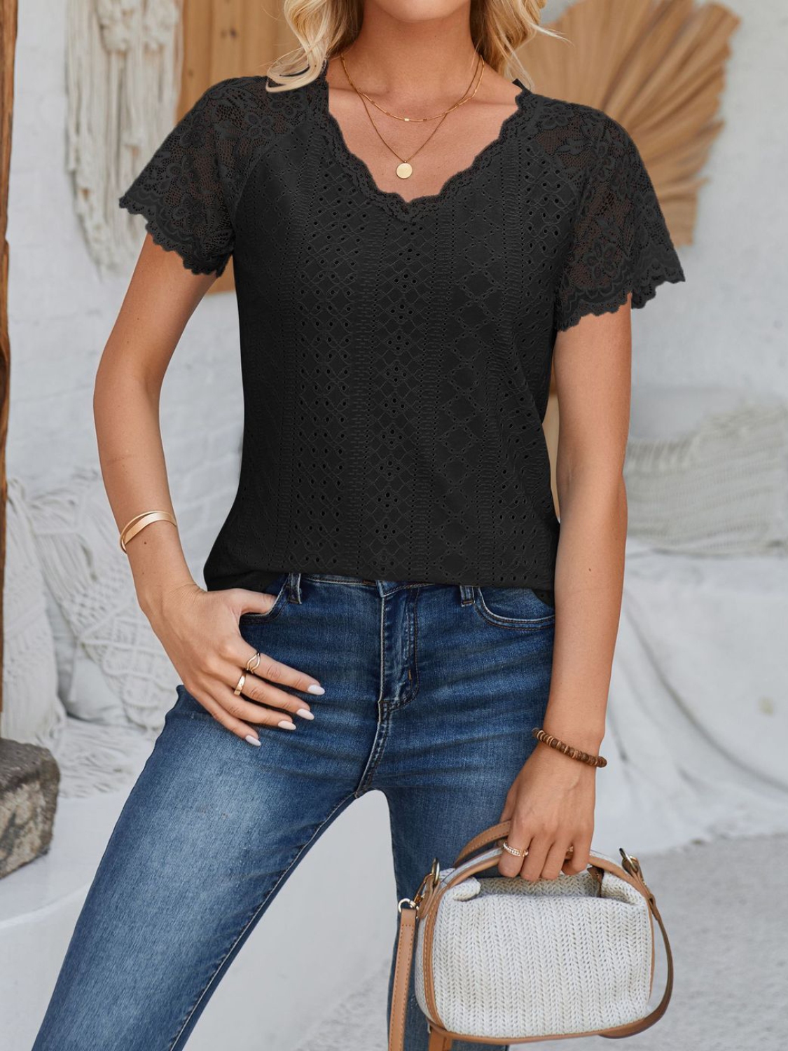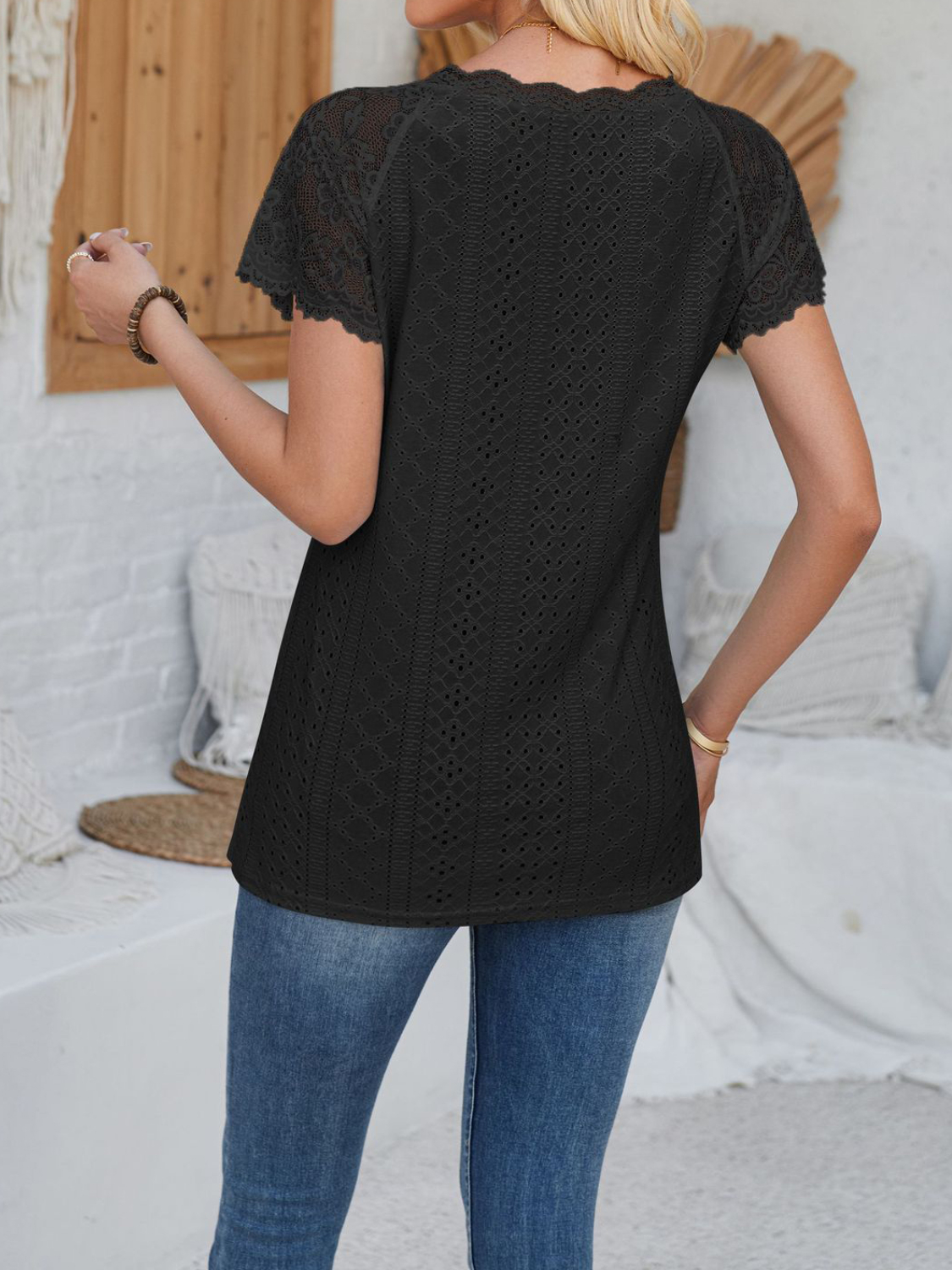 Eyelet Lace Detail V-Neck Short Sleeve Top