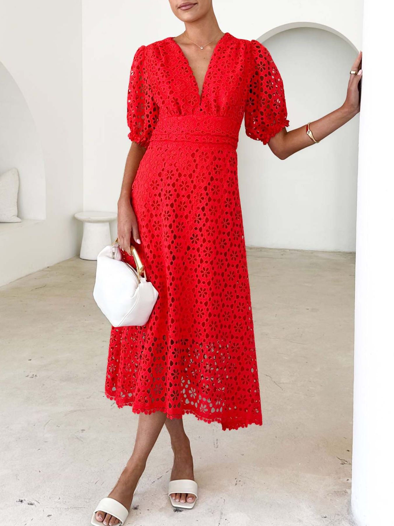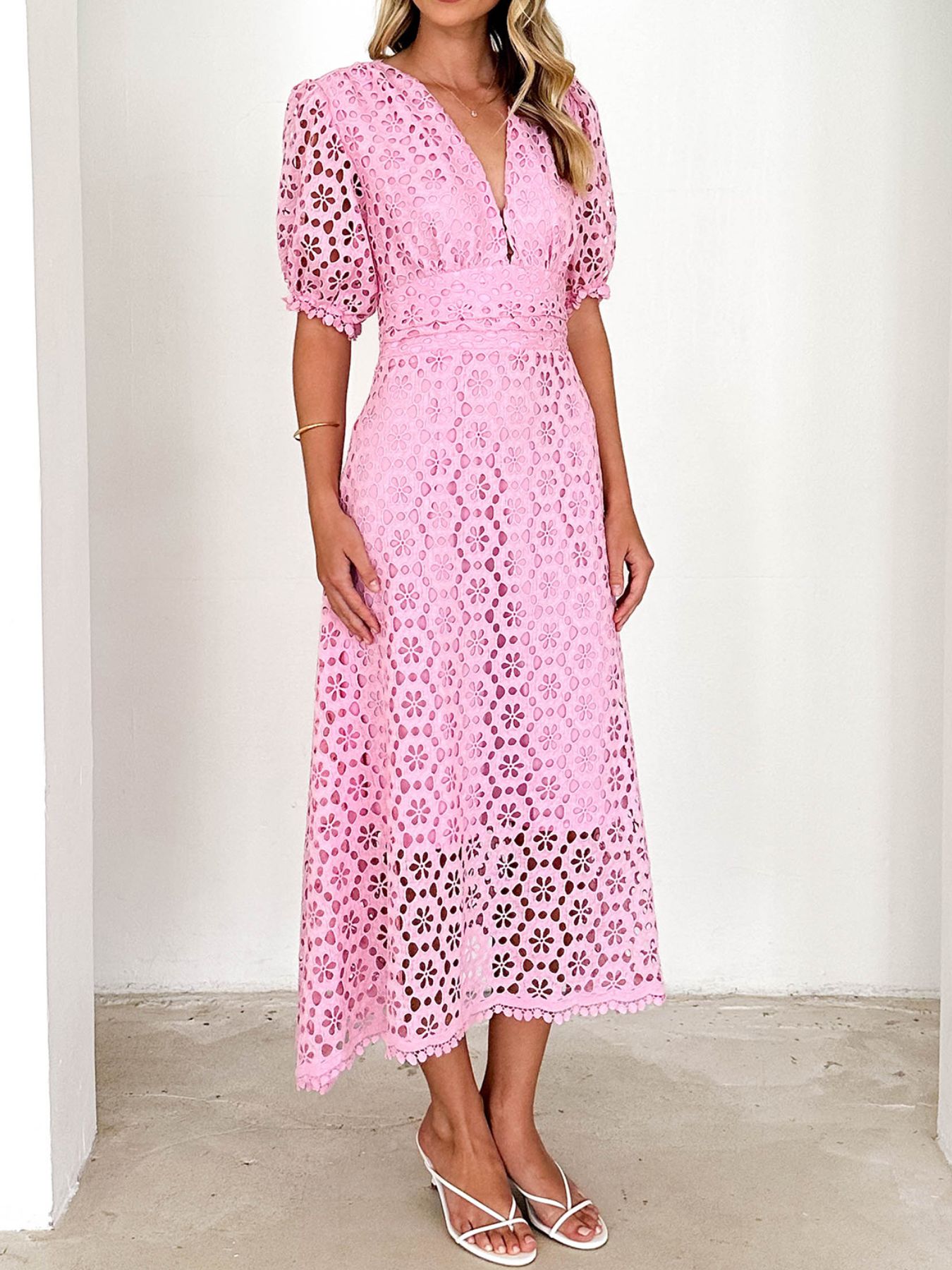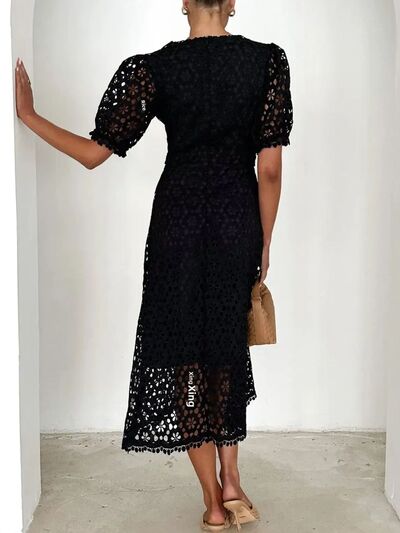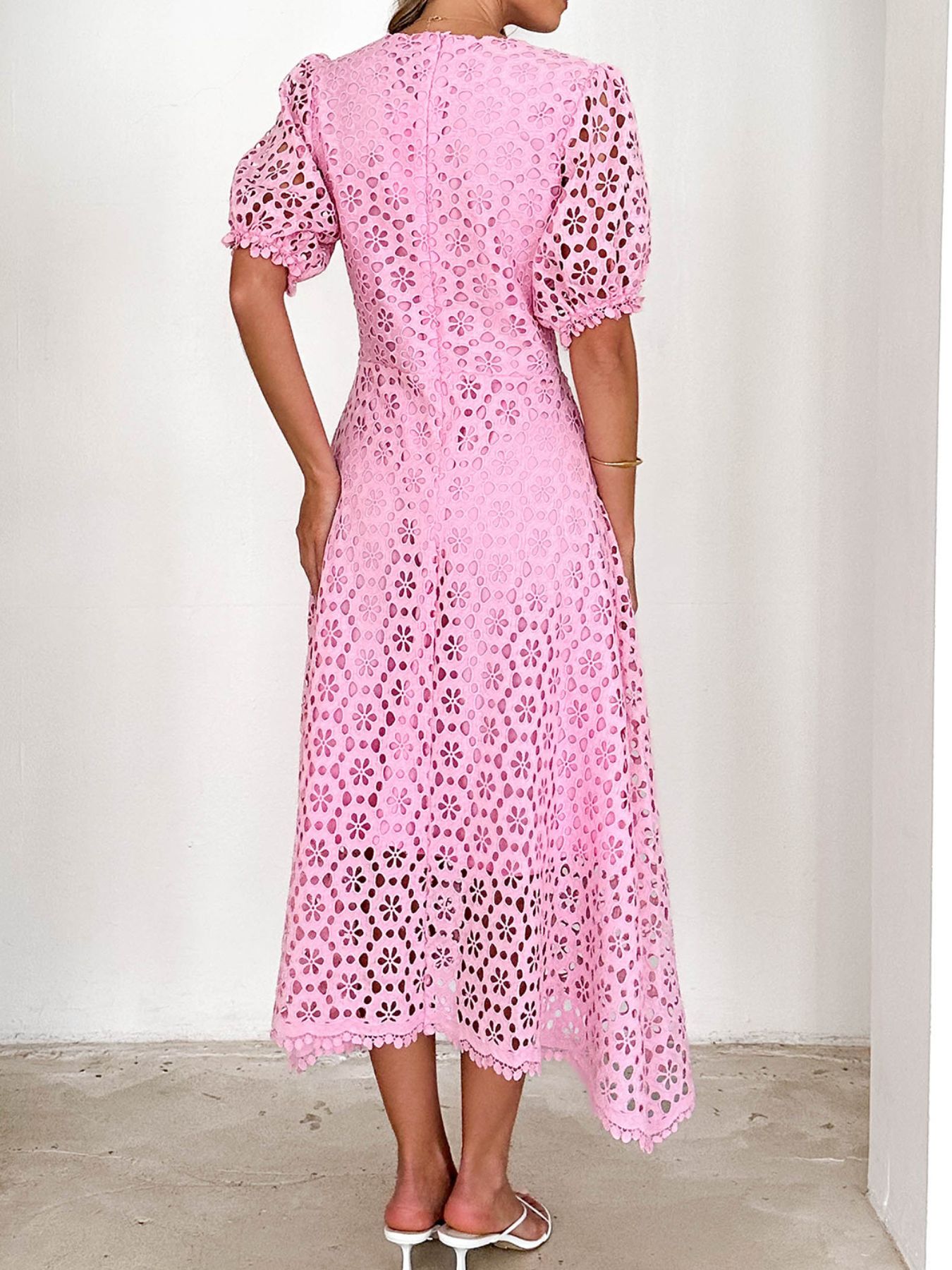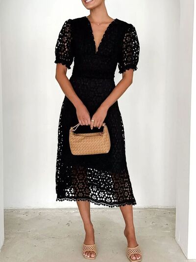 Eyelet Lace V-Neck Midi Dress with Puff Sleeves