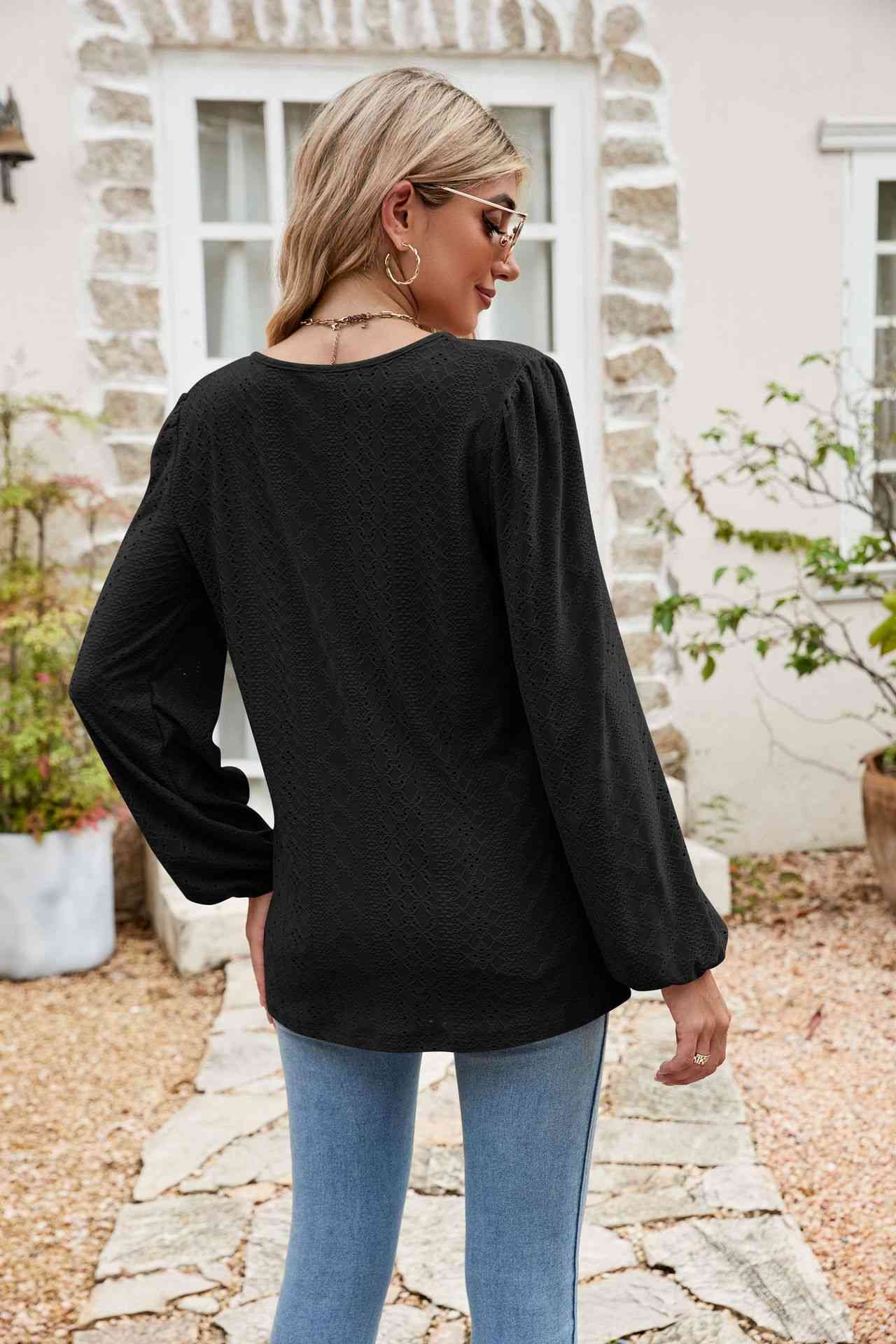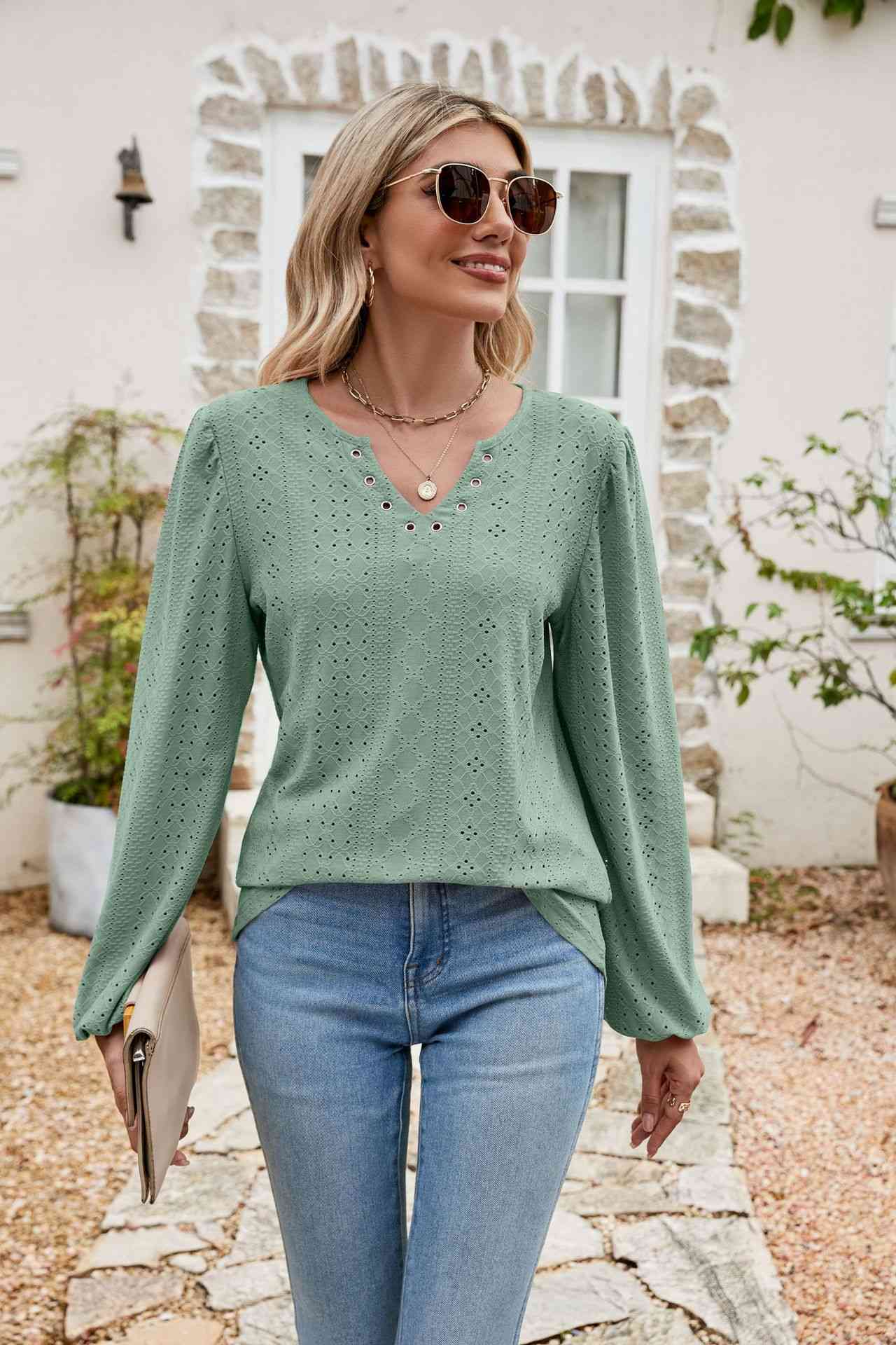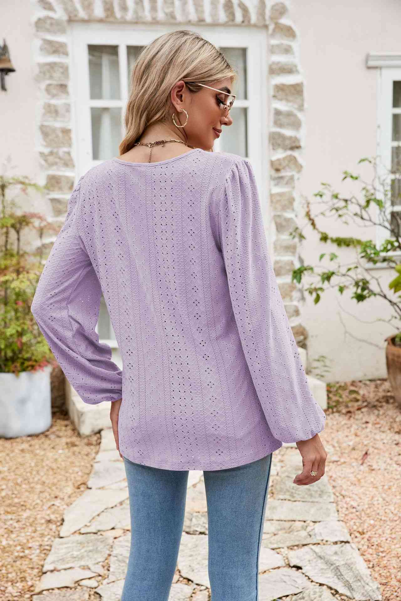 Eyelet Notched Neck Balloon Sleeve Blouse