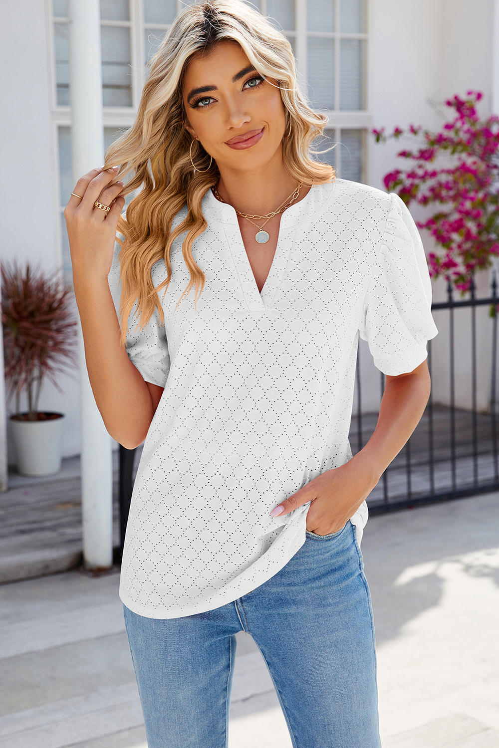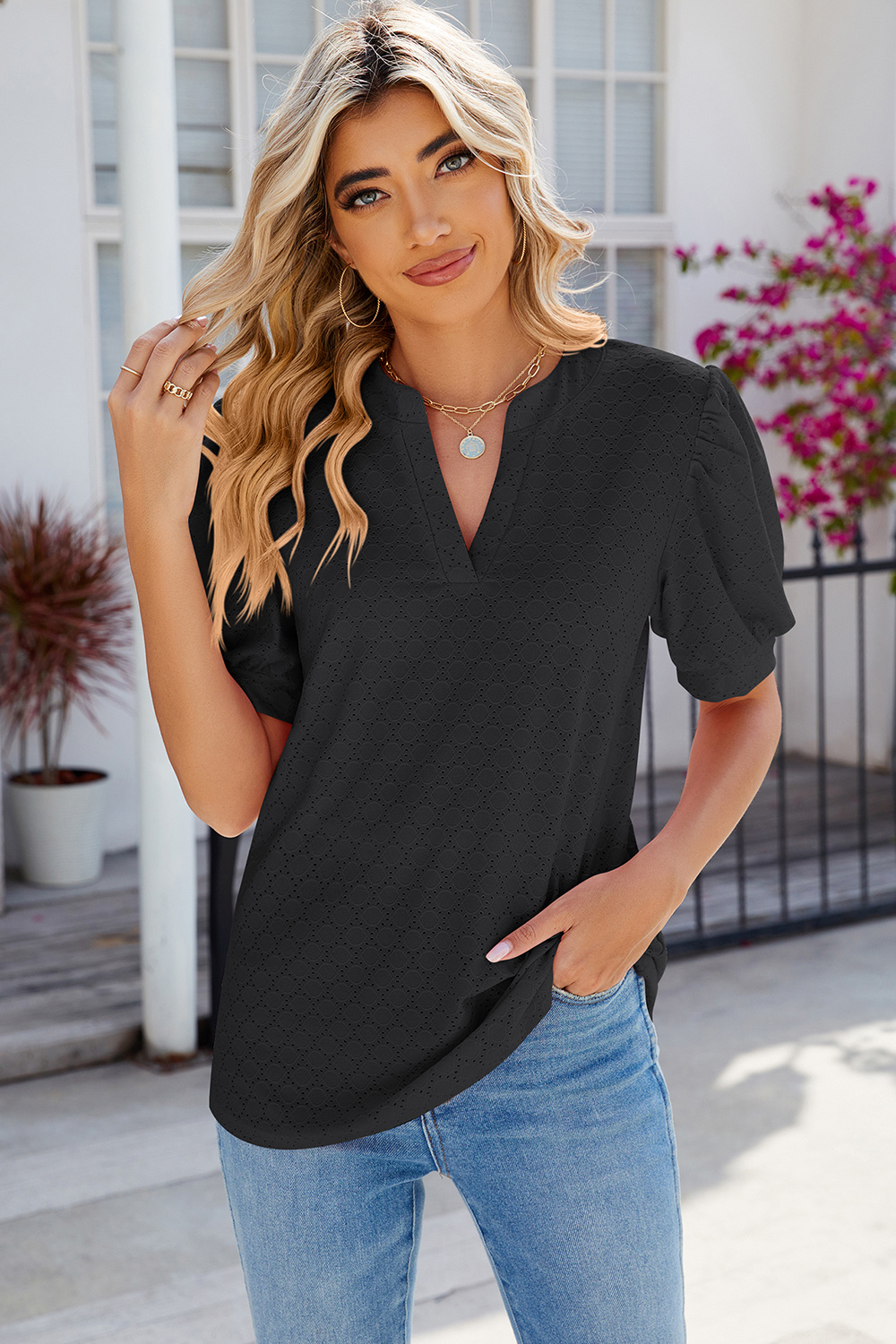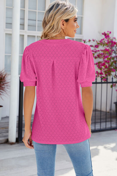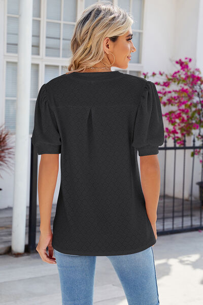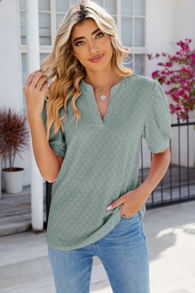 Eyelet Notched Puff Sleeve T-Shirt