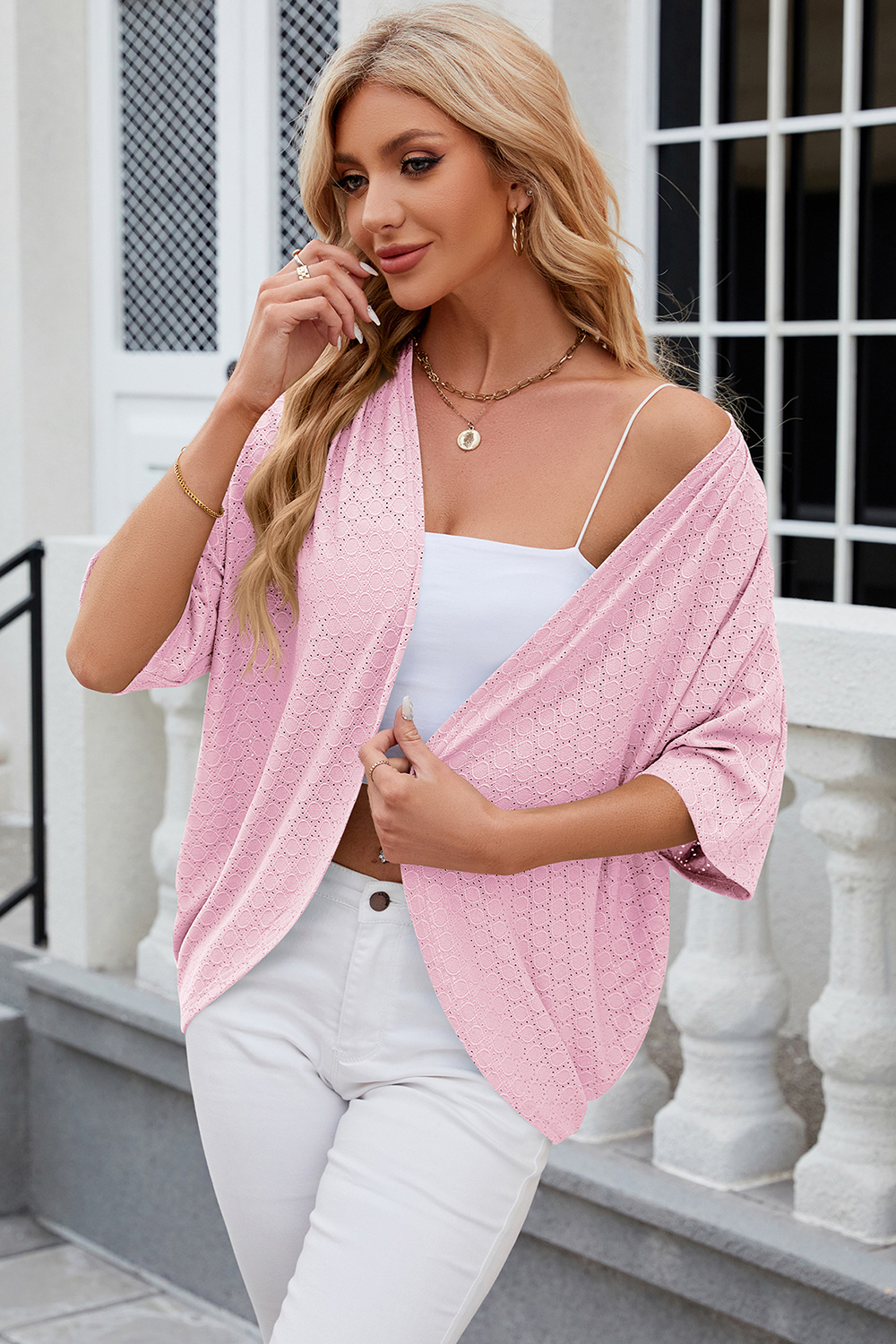 Eyelet Open Front Half Sleeve Cardigan