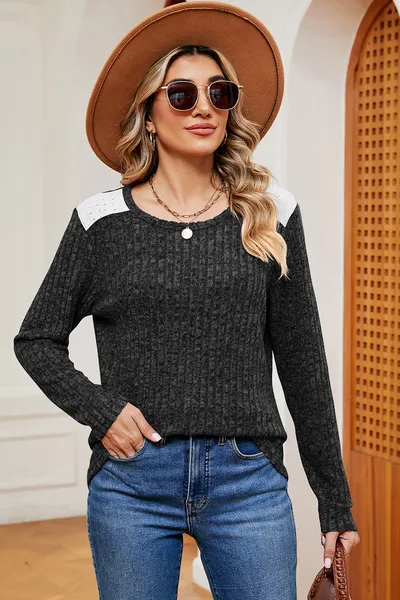 Eyelet Ribbed Round Neck Long Sleeve T-Shirt