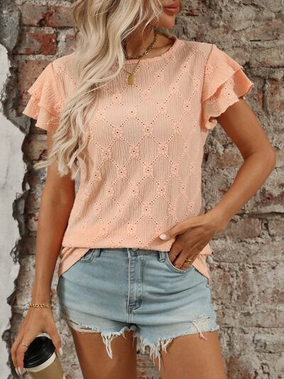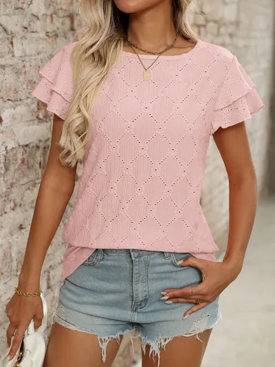 Eyelet Round Neck Double Layered Ruffled Short Sleeve Top