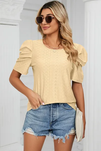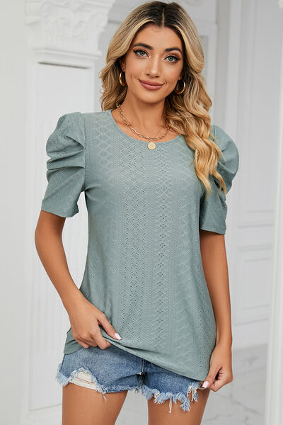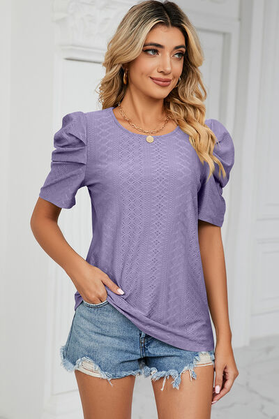 Eyelet Round Neck Puff Sleeve T-Shirt