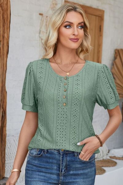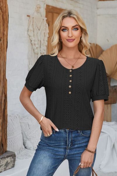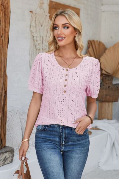 Eyelet Round Neck Short Sleeve Blouse