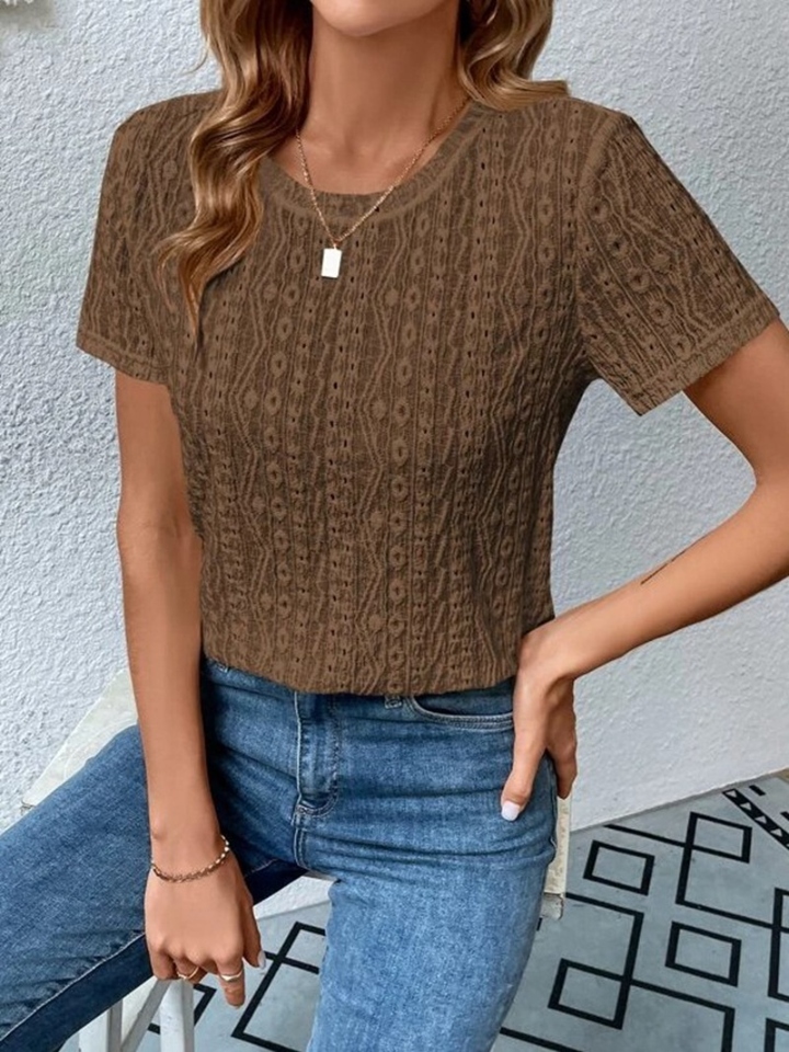 Eyelet Round Neck Short Sleeve T-Shirt