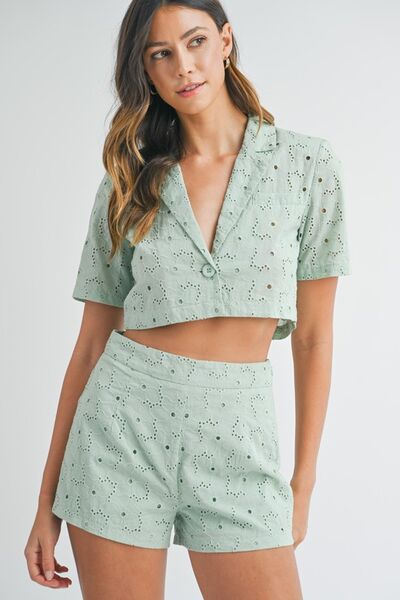 Eyelet Short Sleeve Crop Top and Shorts Set