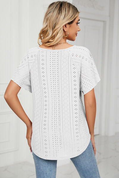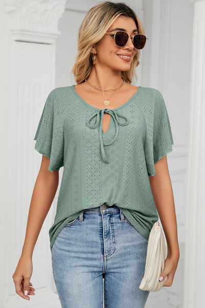 Eyelet Tie Neck Flutter Sleeve Blouse