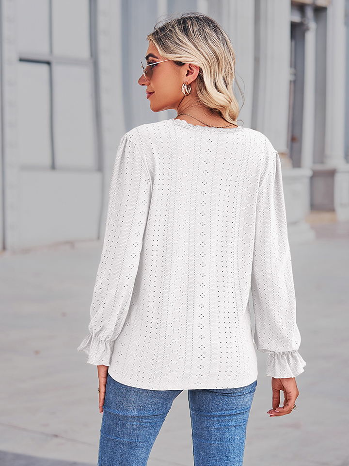Eyelet V-Neck Flounce Sleeve Blouse