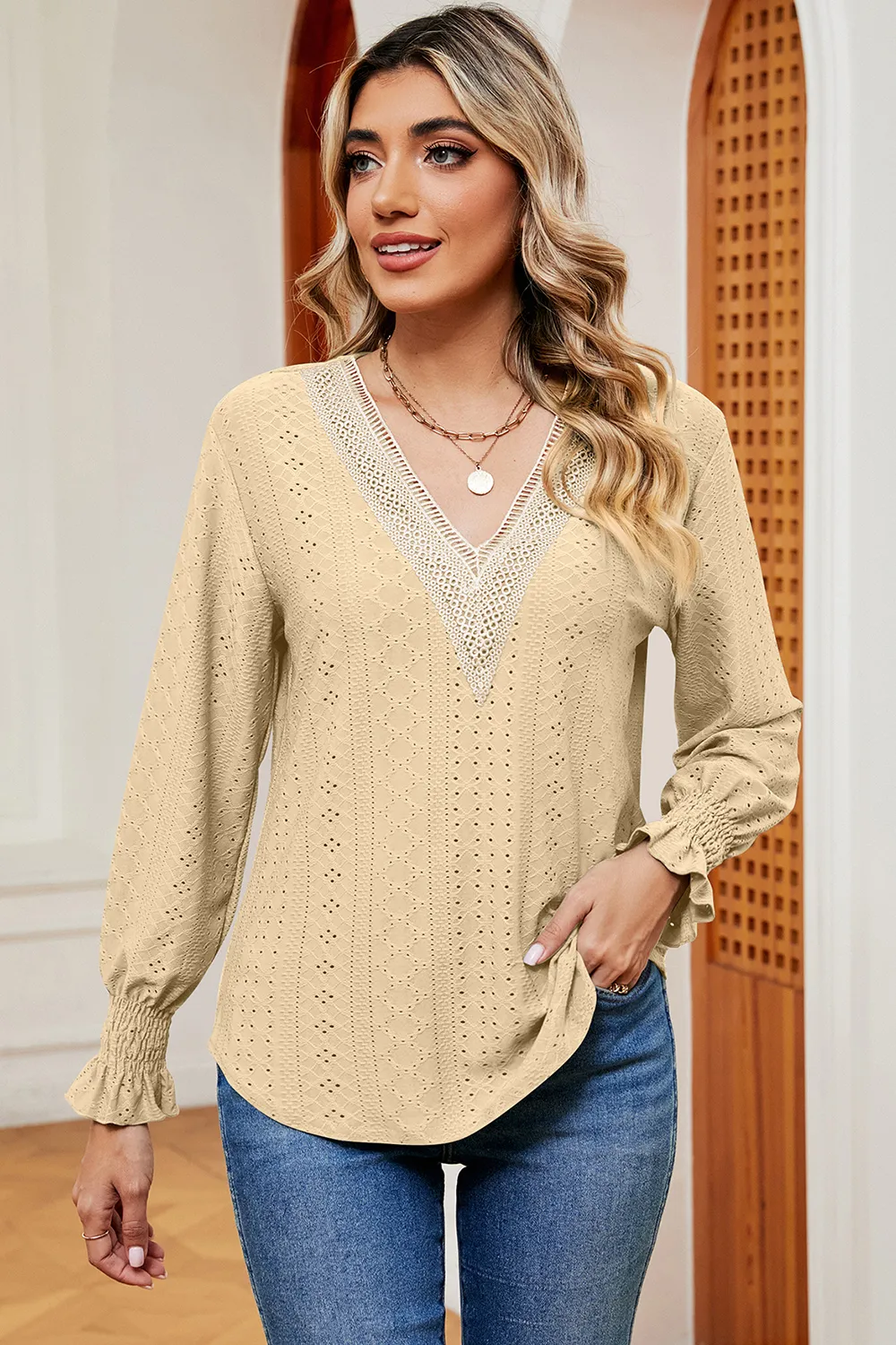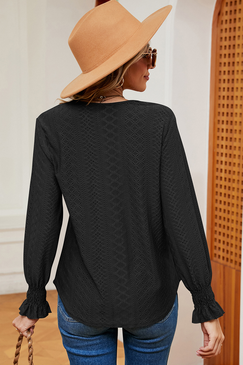 Eyelet V-Neck Flounce Sleeve T-Shirt
